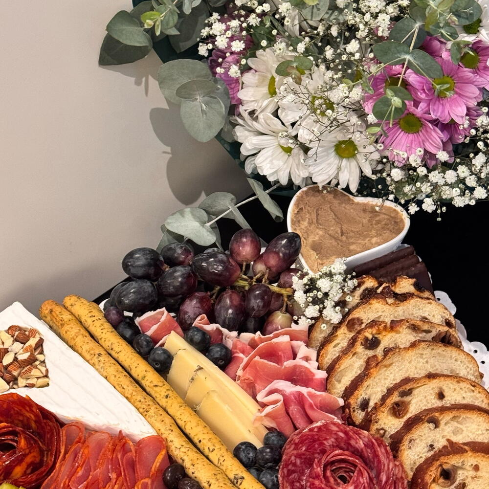 kiwi - 50 гр. белые ромашки - 10 шт. розовые ромашки - 10 шт. орехи - 20 гр. выдержанный сыр - 150 гр. иберийское чоризо - 70 гр. свежая голубика - 30 гр. деревянная доска - 1 шт. гурманский паштет - 150 гр. сыр бри - 200 гр. иберийский сальчичон - 70 гр. отборный хамон серрано - 100 гр. трюфельный сыр - 150 гр. сыр горгонзола - 100 гр. хлеб со вкусом - 200 гр. свежий виноград - 100 гр.