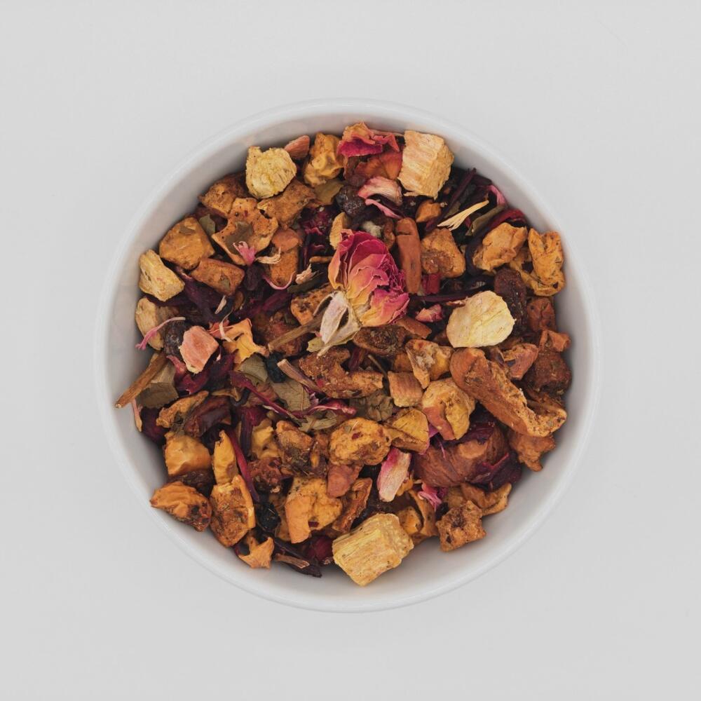 "La mezcla de frutas Fruta del Dragón es una combinación de ingredientes exóticos y refrescantes que crean una deliciosa y beneficiosa bebida. Cada sorbo está lleno de aromas frutales y notas florales que satisfacen tus sentidos y te transportan a un paraíso tropical. Es una mezcla de frutas perfecta para disfrutar tanto caliente como fría, y es una excelente opción para aquellos que buscan una bebida saludable y refrescante. Su sabor único y lleno de matices no te dejará decepcionado. Ingredientes: trocitos de manzana (manzana, acidulante: ácido cítrico), flores de hibisco, pasas, hojas de mora dulce, aroma natural, bayas de saúco, trocitos de fruta del dragón (fruta del dragón, harina de arroz)(1,5%), hojas de flor de rosa, pedacitos de ruibarbo, flores rosadas de aciano 10 min 100C 4gr /200ml