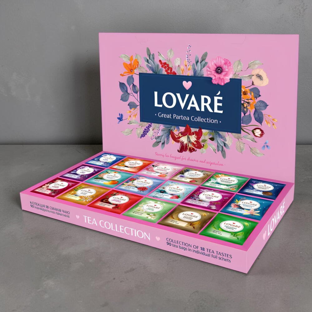 Lovare Great ParTea Collection (90 paquetes) es una exquisita colección de té para verdaderos conocedores del sabor y el aroma. El juego contiene 90 bolsitas de té con diferentes sabores, desde afrutados hasta clásicos, y será una excelente solución para cafeterías, hoteles y restaurantes del segmento HoReCa. Un fantástico set para una gran fiesta: té para todos los gustos, incluso para los invitados más exigentes. El juego Lovare Great ParTea también será un excelente regalo para los amantes del té de calidad. El paquete contiene 18 variedades de 5 sobres.