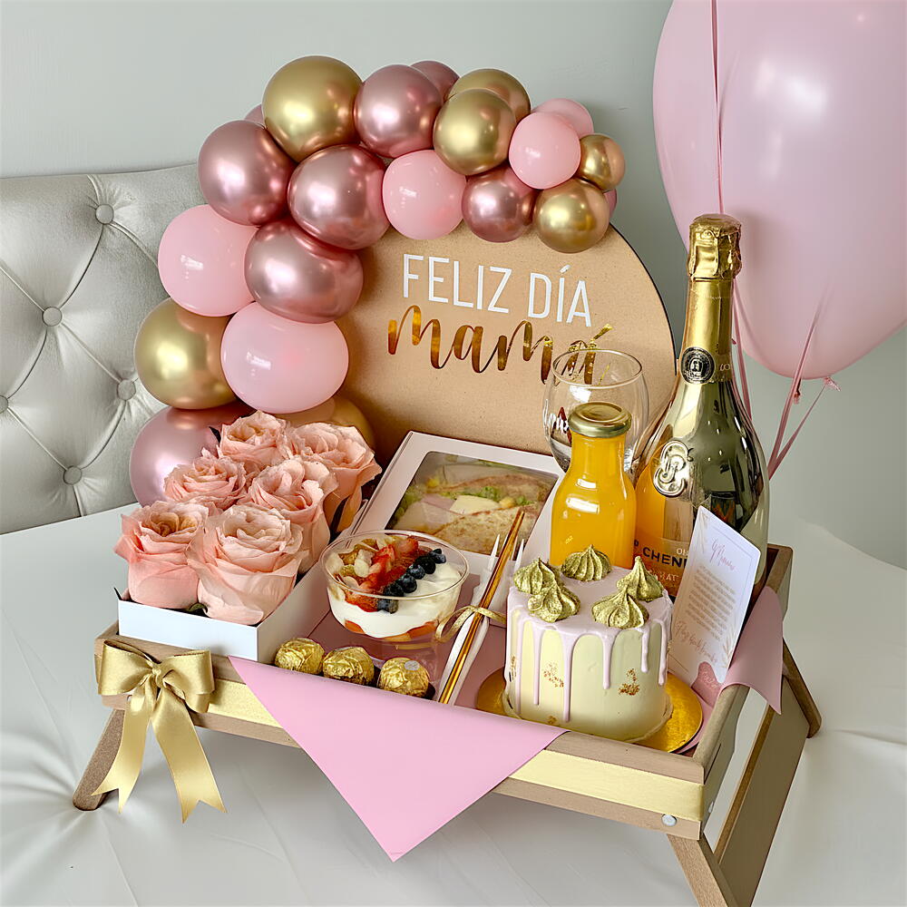 rosas - 6 ud. bombones ferrero rocher - 3 ud. pastel mini decorado con crema lila y detalles dorados - 1 ud. caja con sándwich gourmet - 1 ud. botella de jugo natural - 1 ud. botella de espumante - 1 ud. copa de cristal decorativa - 1 ud. decoración con globos metálicos en tonos rosa y dorado - 1 ud. cartel con la frase “feliz día mamá” - 1 ud. copa de yogur con fresas arándanos y granola - 1 ud.