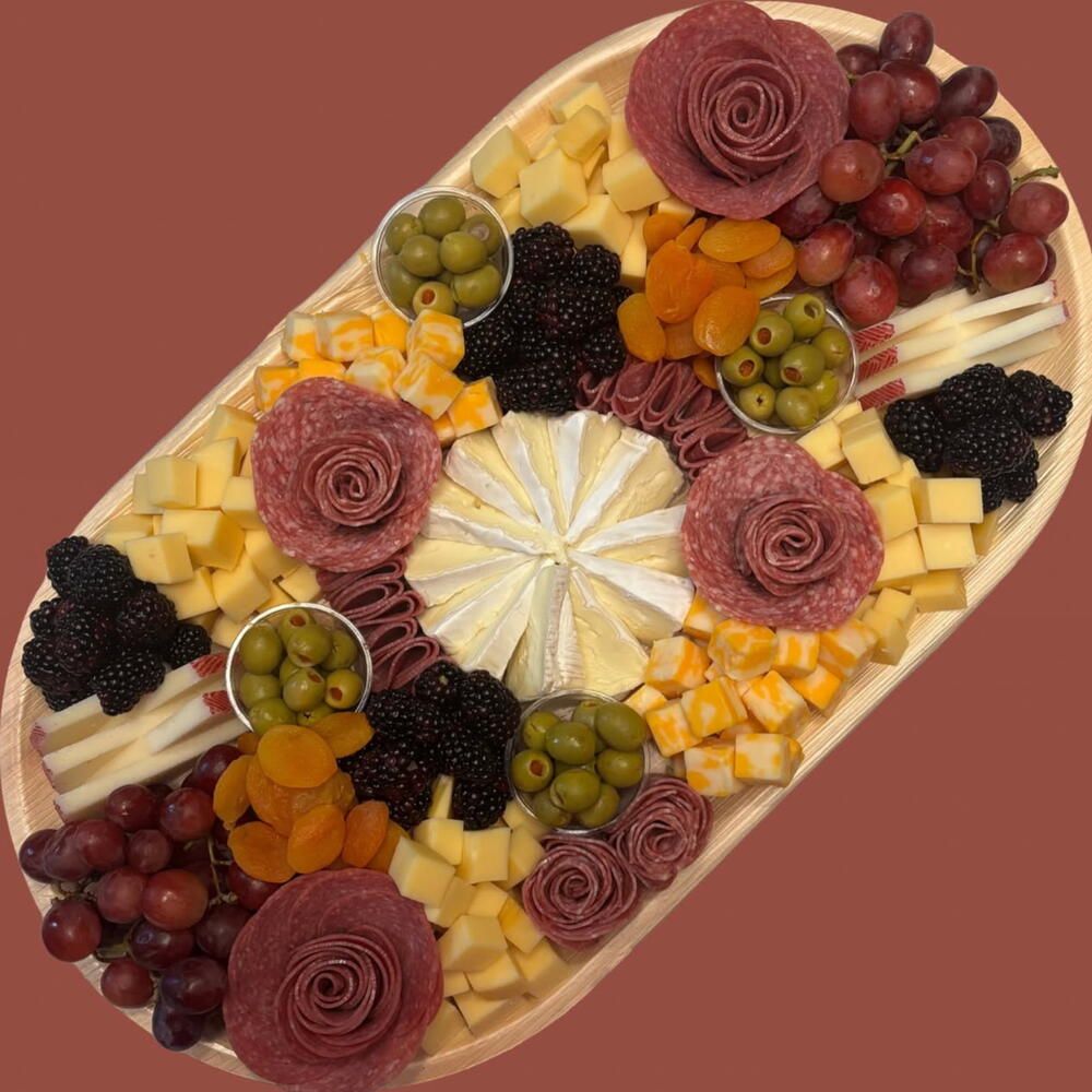 uvas - 1 ud. moras - 1 ud. queso edam holland kroon bola tierno - 1 ud. chorizo - 1 ud. jamón - 1 ud. queso curado - 1 ud. aceitunas verdes - 1 ud. queso brie - 1 ud. queso emmental - 1 ud. queso tierno de cabra - 1 ud.