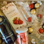 bombones ferrero rocher - 6 ud. corazones de chocolate - 6 ud. tableta de chocolate con almendras simón coll - 1 ud. 5cl - 1 ud. copas de cava - 2 ud. frasco relleno con gominolas en forma de corazón - 1 ud. botellín de champagne moet y chandon 37 - 1 ud.