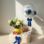 Elegante cesta de desayuno para comenzar el día con alegría y deleite. Contiene un atractivo jarrón de cristal con preciosas rosas, acompañado de una suculenta selección de productos. Disfruta de deliciosos croissants, la riqueza del Cappuccino, el dulzor de las frutas como los plátanos y manzanas, y el sabor intenso del zumo de naranja. Añade mantequilla y mermelada de fresa para darle un toque indulgente a tus mañanas. La cesta también incluye lomo, jamón ibérico y aceite de oliva, perfectos para los amantes de los sabores fuertes y auténticos. Además, incluye un artículo personalizado exclusivo de Glovo. Una manera perfecta de mimarte a ti o a alguien especial. Las rosas podrían ser rojas y el texto del glovo - te quiero - te amo