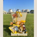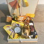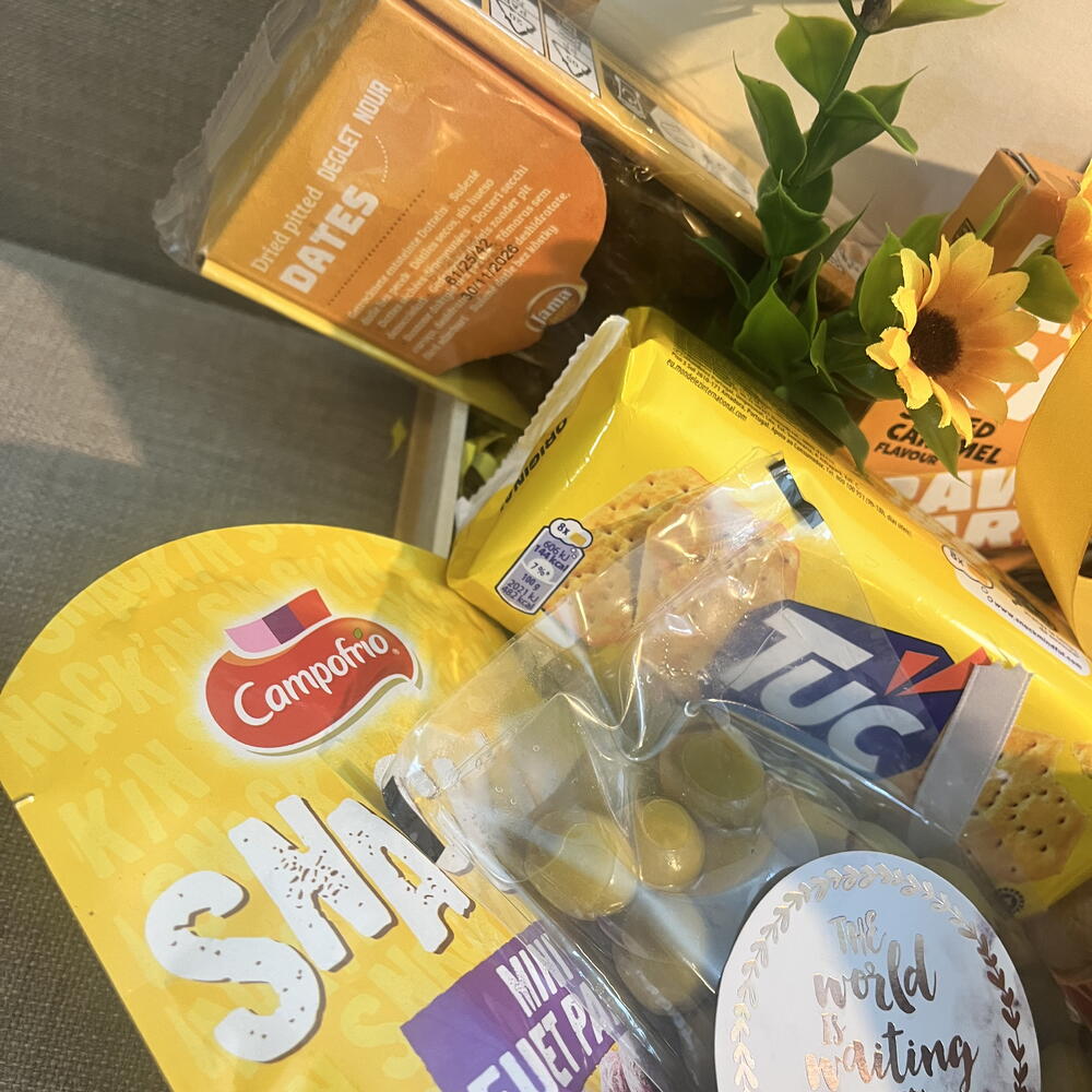 ✨ Porque cuando no puedes estar cerca, un detalle bien pensado dice todo por ti 😍 sorprende a esa persona Especial Este arreglo regalo elegante y luminoso ha sido diseñado para quienes desean enviar cariño, apoyo y presencia emocional a un ser querido que se encuentra lejos, convirtiendo la distancia en un gesto cálido y significativo. ❤️ La presentación destaca por su caja rígida de acabado natural con base color madera, abierta en formato libro, decorada con un lazo satinado en tonos dorado y blanco, símbolo de celebración, esperanza y buenos deseos. ✨Su interior está cuidadosamente organizado sobre viruta decorativa amarilla , aportando un aire fresco, natural y armonioso. 🎁 Composición detallada del regalo: * 🍫 Tableta de chocolate premium negro, elegante e intensa, ideal para momentos de disfrute personal. * 🍫 Barra Raw Bar sabor caramelo salado, opción moderna y natural para quienes cuidan su alimentación. * 🍫 Barra Rice Bar de chocolate con caramelo, equilibrio perfecto entre sabor y textura. * 🍪 Galletas saladas TUC, un clásico para compartir o disfrutar en cualquier momento. * 🍬 Snacks dulces y salados variados, cuidadosamente seleccionados para crear una experiencia completa. * 🥜 Dátiles naturales, aporte energético y saludable. * 🍭 Mini fuet snack, un toque gourmet que añade carácter al conjunto. * 🫙 Tarro Paté de pollo. * 🧸 Figura decorativa tipo leoncito, símbolo de fuerza, protección y cariño. * 🌻 Flores decorativas amarillas girasol, que transmiten alegría, luz y optimismo. * 📝 Tarjeta para dedicatoria, perfecta para personalizar el mensaje y hacerlo inolvidable. ✨Cada elemento está colocado con intención, creando un regalo equilibrado que combina sabores, emociones y detalles visuales, pensado para sorprender y reconfortar desde el primer momento.