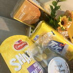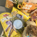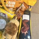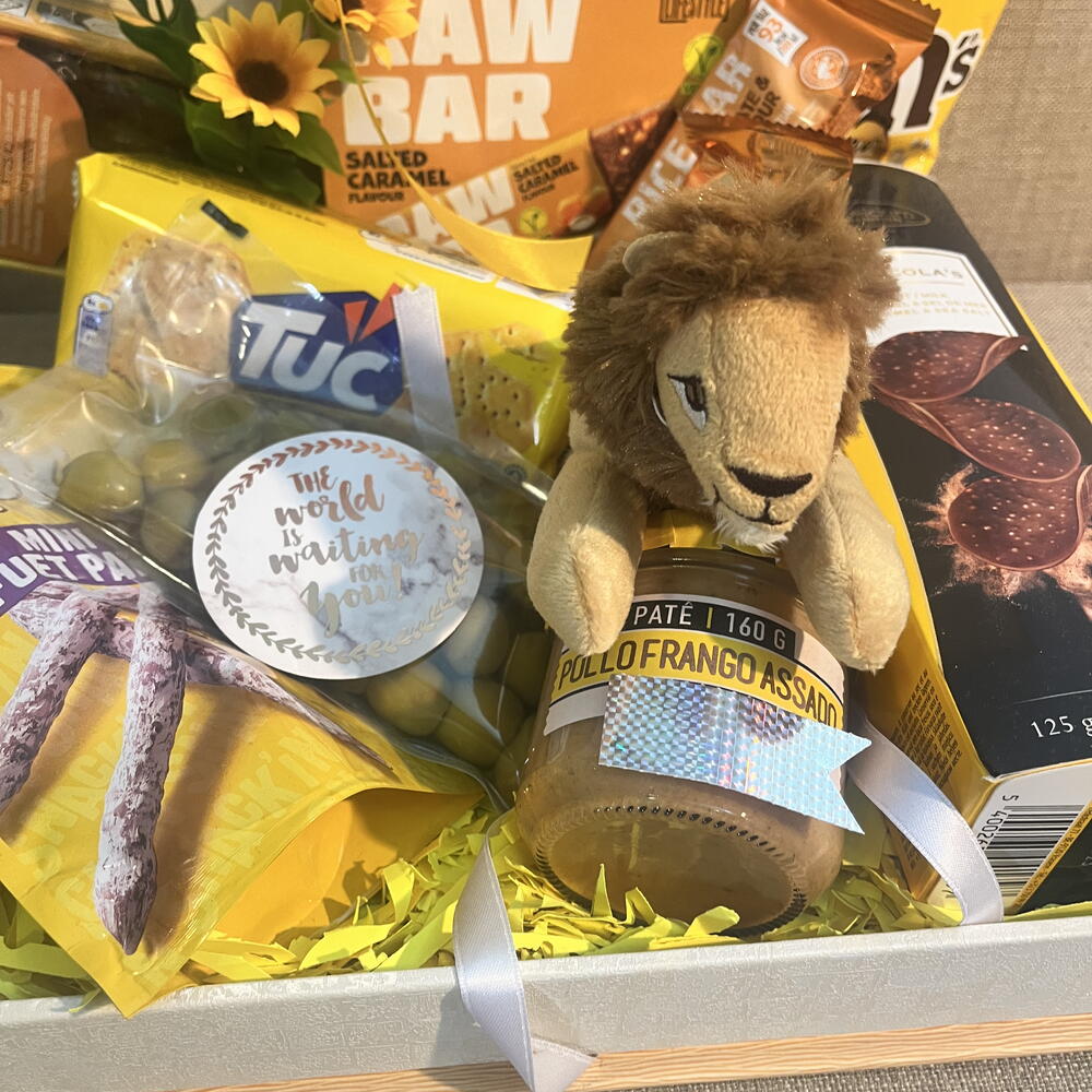 tarjeta de dedicatoria - 1 ud. aceitunas - 20 gr tableta de chocolate premium negro - 1 ud. barra raw bar sabor caramelo salado - 1 ud. barra rice bar de chocolate con caramelo - 1 ud. galletas saladas tuc - 1 ud. león peluche - 1 ud. m&m mani - 1 ud. dactiles naturales - 1 ud. pate de pollo - 1 ud. snacks mini fuet - 1 ud. flores girasol - 3 ud.