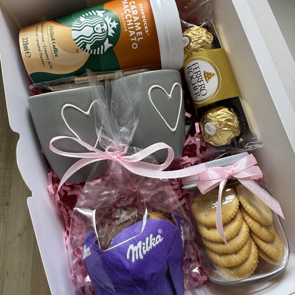chocolates ferrero - 1 ud. muffin - 1 ud. café caramelo starbucks - 1 ud. galletas saladitas - 1 ud. tazas pareja - 2 ud.