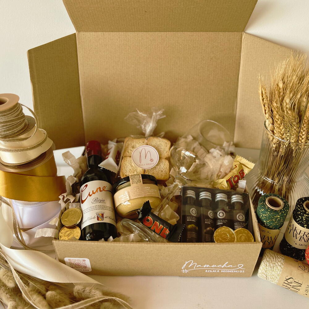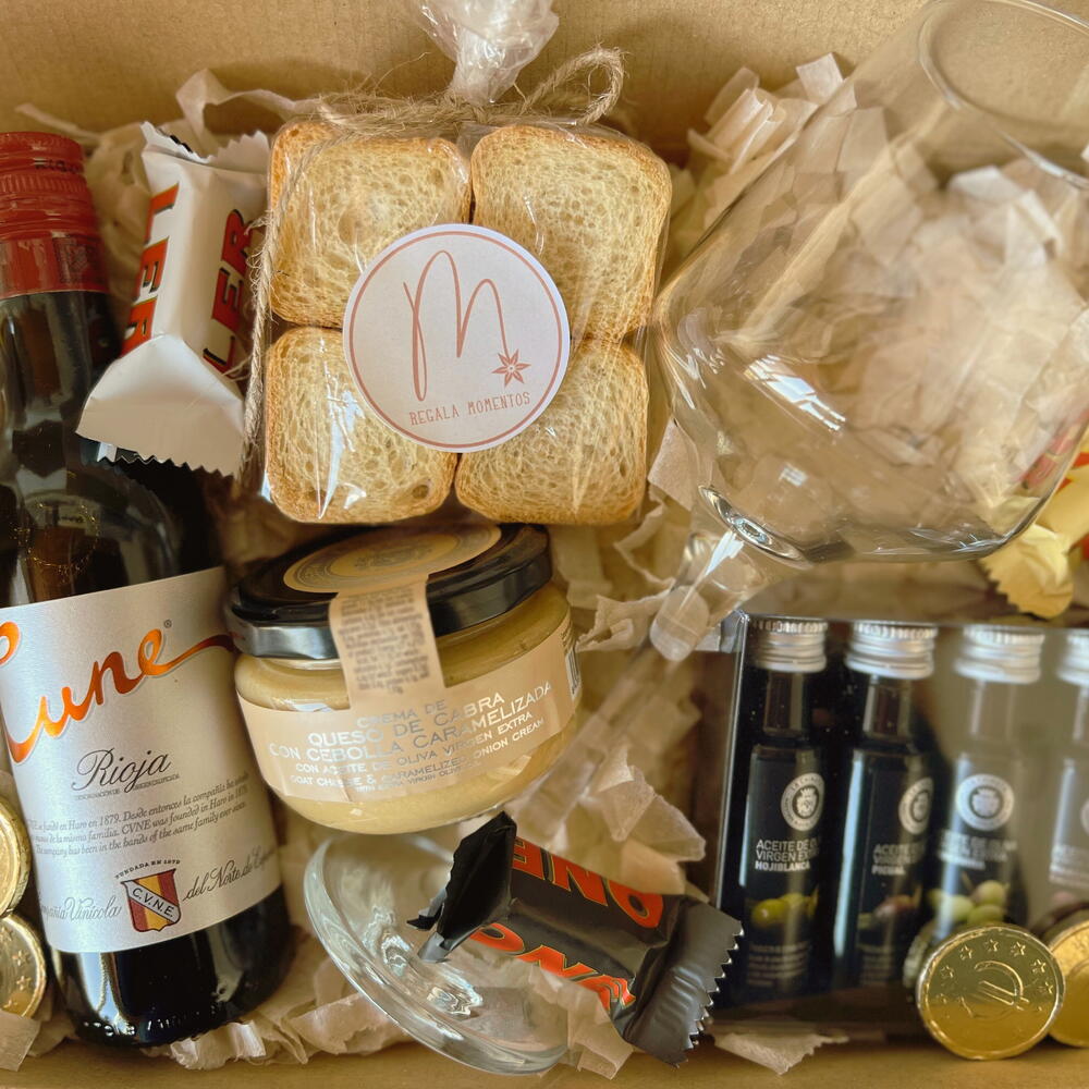 La caja gourmet “Cata de Aceites 1” es el detalle perfecto para los amantes de la buena mesa y los sabores auténticos. Diseñada como una experiencia completa de degustación, combina un exquisito botellín de vino Cuné con una selección de aceites de oliva saborizados de La Chinata, ideales para descubrir matices nuevos en cada bocado. El set incluye tostadas crujientes, un sabroso paté y chocolates Toblerone, creando una armonía deliciosa entre lo salado y lo dulce. Todo llega presentado en una elegante caja lista para regalar, convirtiéndose en una opción perfecta para celebraciones, agradecimientos, eventos corporativos o simplemente para darse un capricho gourmet en casa.