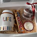 taza de cerámica - 1 ud. muffin chocolate - 2 ud. café caramelo starbucks - 1 ud. vela aromática - 1 ud. chocolate twix xl - 1 ud.
