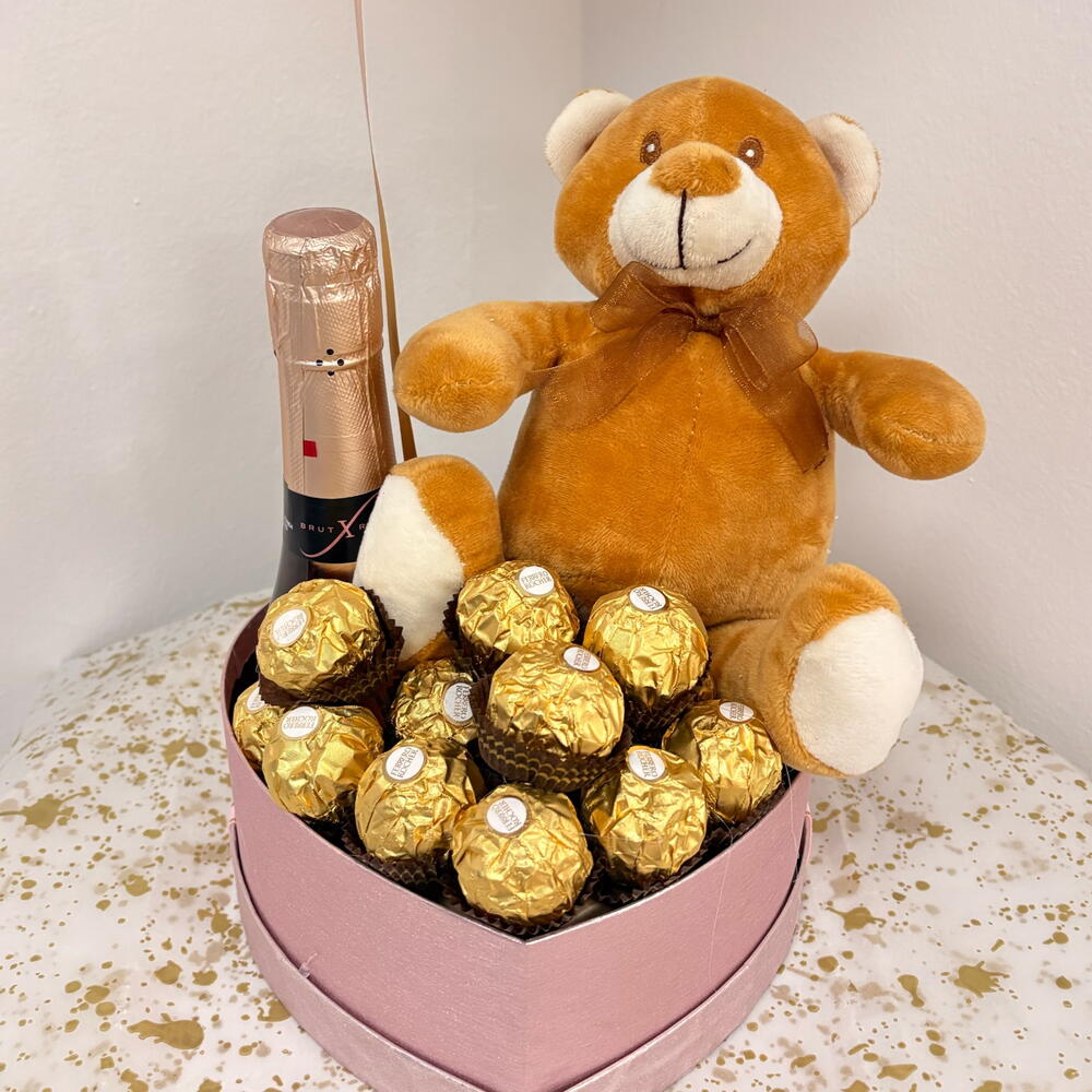 osito de peluche - 1 ud. bombones ferrero rocher - 14 ud. toppers en forma de corazón - 2 ud. botella mini champaña - 1 ud.