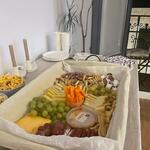 queso curado - 200 gr uvas verdes - 500 gr hummus - 100 gr uvas rojas - 500 gr queso con trufa - 200 gr queso old amsterdam - 150 gr queso madurado - 150 gr fuets - 3 ud. bastones de zanahoria - 12 ud. serenitos con aceite de oliva - 100 gr
