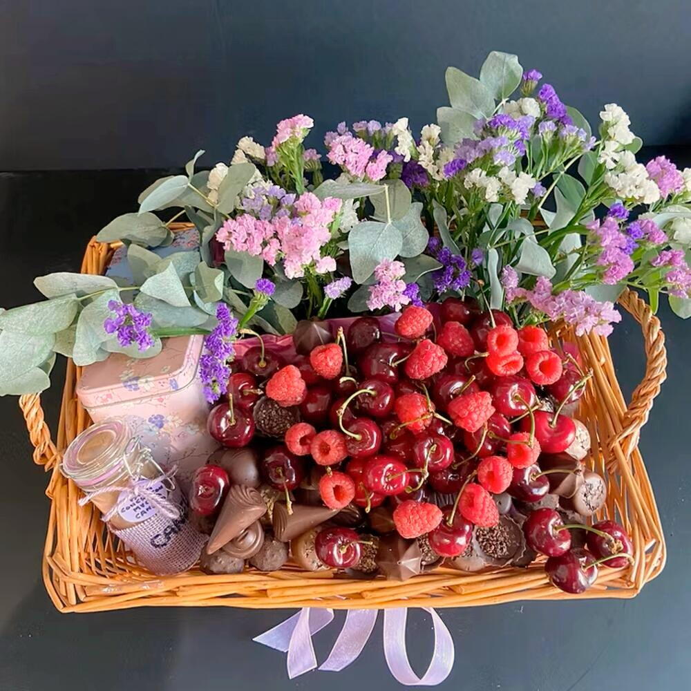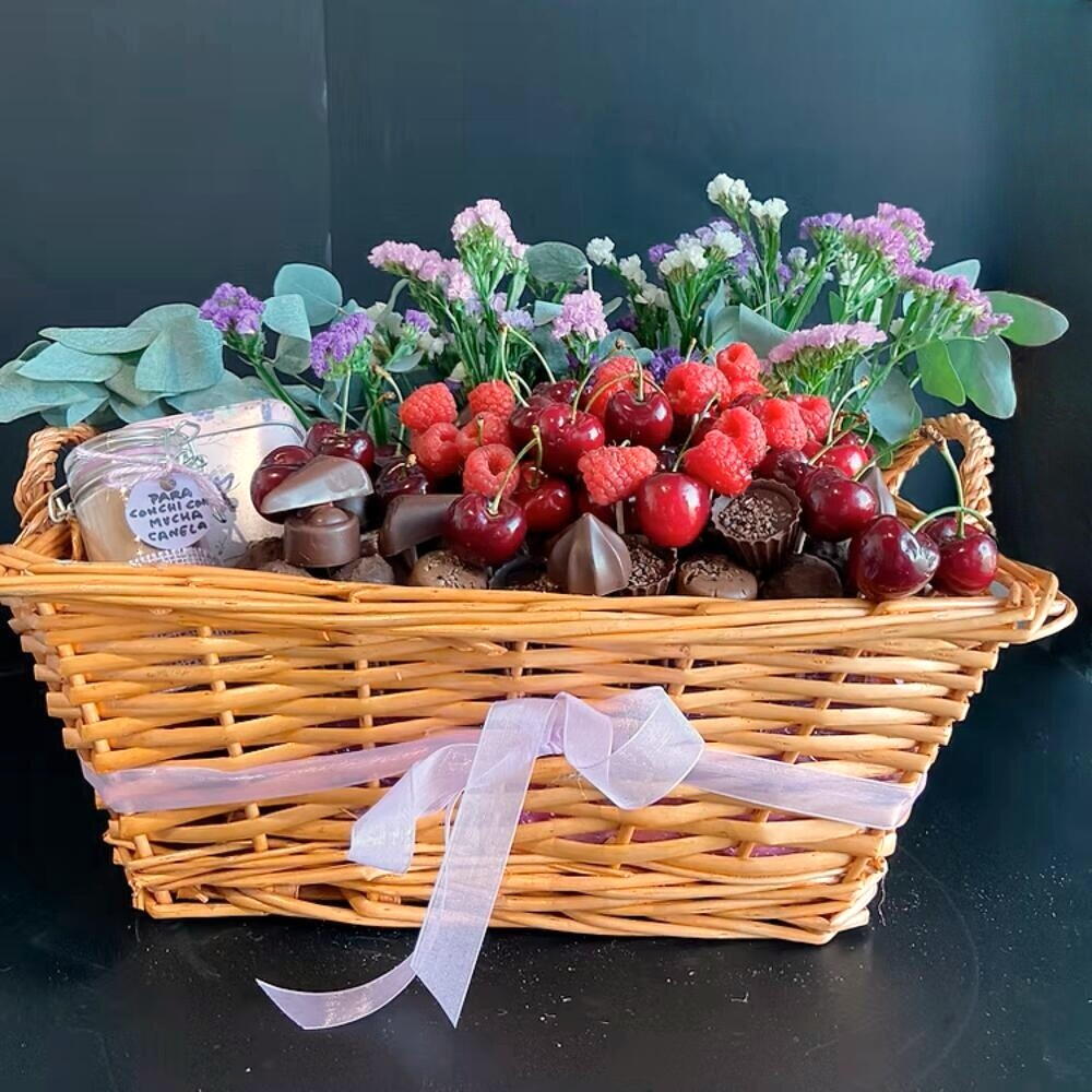 Una explosión de dulzura y belleza en una sola cesta. Esta encantadora creación reúne frutas frescas como cerezas y frambuesas, bombones artesanales y chocolates variados, acompañados por flores decorativas artificiales que nunca se marchitan. Además, incluye dos cajas con infusión de Rooibos y Canela, perfectas para una pausa cálida y aromática. Ideal para sorprender en cumpleaños, aniversarios o como un gesto especial de cariño. Su presentación colorida y cuidada hace de esta cesta un regalo inolvidable que combina sabor, bienestar y estética. Conservar en un lugar fresco, preferentemente refrigerado si no se consume de inmediato. Las frutas deben disfrutarse en los primeros 1-2 días para mantener su frescura. Los bombones deben mantenerse lejos del sol o fuentes de calor. Las flores no necesitan agua, ya que son 100% artificiales y duraderas. Las infusiones pueden conservarse a temperatura ambiente en lugar seco.