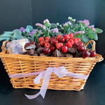 eucalipto - 6 ud. bombones de chocolate - 150 gr frambuesas - 150 gr cerezas frescas - 250 gr trufas artesanales - 10 ud. caja con canela - 1 ud. artificiales statice - 8 ud. caja con té rooibos - 1 ud.