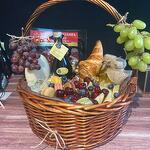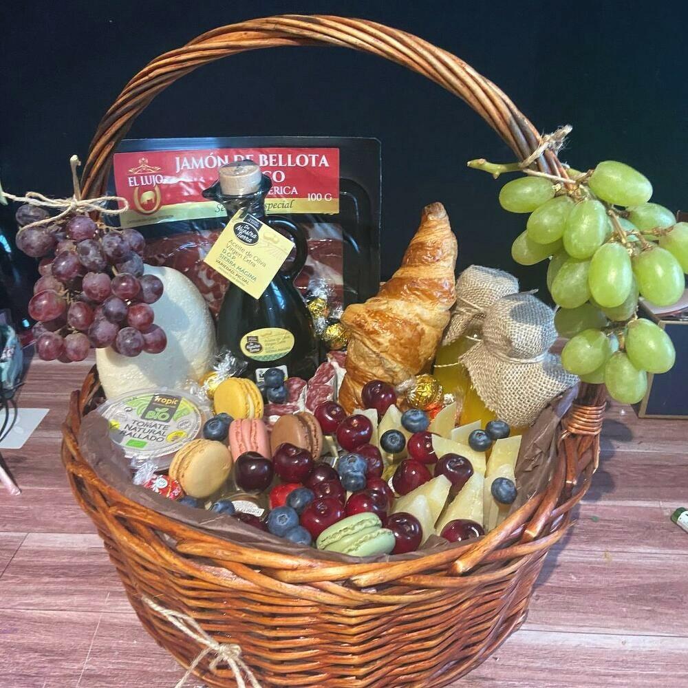 Una canasta gourmet completa que combina sabores dulces y salados en una presentación elegante. Incluye jamón ibérico de bellota, queso curado, uvas rojas y verdes, cerezas, arándanos, croissant, miel artesanal, macarons surtidos, bombones Ferrero Rocher, paté vegetal y una botella de aceite de oliva virgen extra. Todo dispuesto cuidadosamente en una canasta de mimbre con asa, ideal para regalar en celebraciones especiales o disfrutar en un brunch o picnic. Se recomienda conservar los productos frescos en refrigeración y los secos en un lugar fresco y seco.