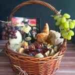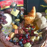 cerezas - 100 gr croissant - 1 ud. bombones ferrero rocher - 6 ud. queso curado - 150 gr uvas verdes - 150 gr uvas rojas - 150 gr arándanos - 50 gr aceite de oliva virgen extra - 1 ud. jamón ibérico de bellota - 100 gr miel artesanal - 1 ud. macarons surtidos - 5 ud. paté vegetal - 1 ud.