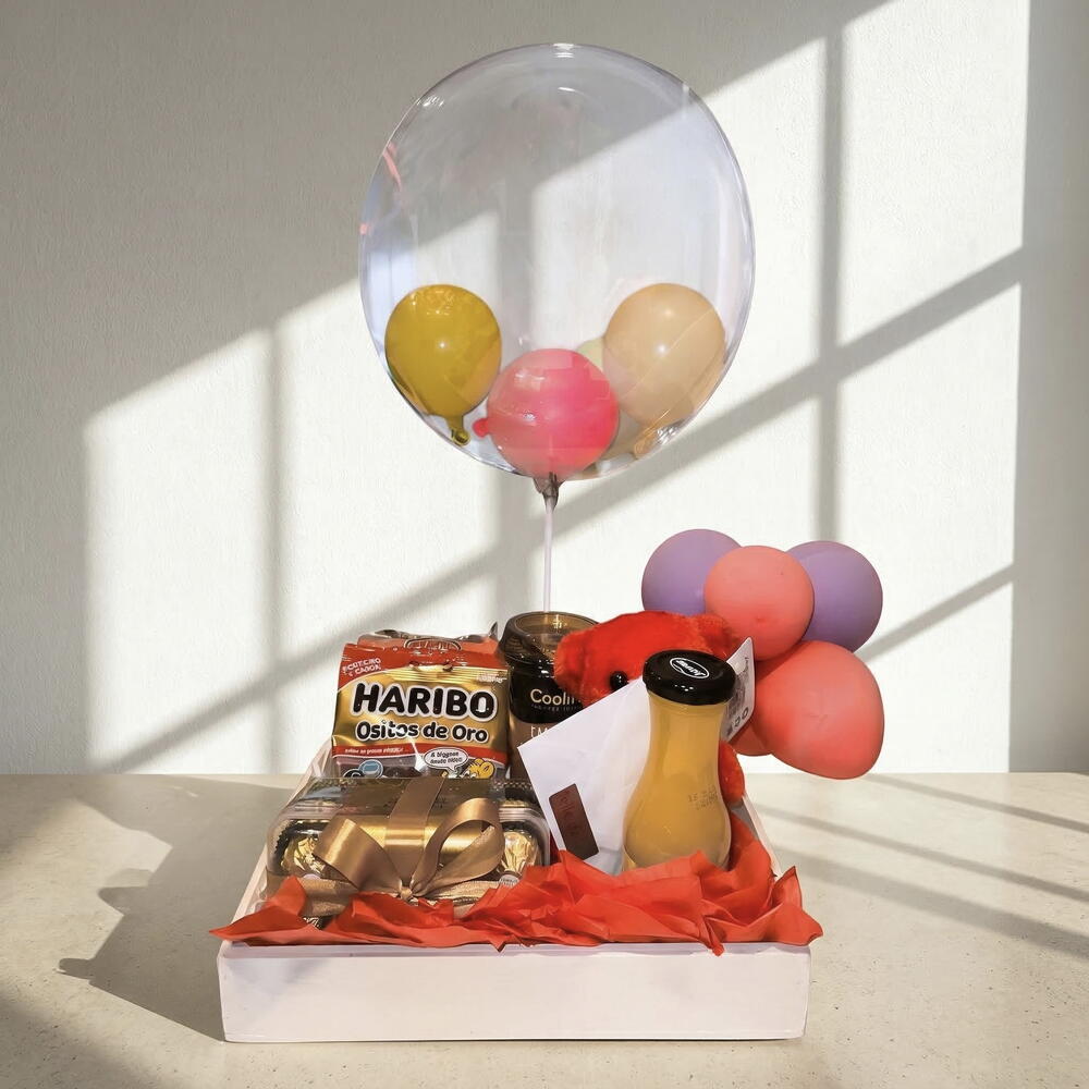 Esta encantadora cesta golosa está llena de detalles para alegrar el día de esa persona especial. Con una mezcla deliciosa de chocolate Ferrero Rocher, caramelos Haribo, café latte y jugo de naranja, junto a globos coloridos y una cesta de madera decorativa, es el regalo perfecto para ocasiones como cumpleaños, aniversarios o cualquier momento que merezca ser celebrado. Recomendaciones de cuidado: Al ser una cesta de regalo con productos comestibles, asegúrate de mantenerla en un lugar fresco y seco para preservar su sabor y calidad. Los globos pueden durar varias horas, pero recuerda que son objetos frágiles y deben ser manejados con cuidado.