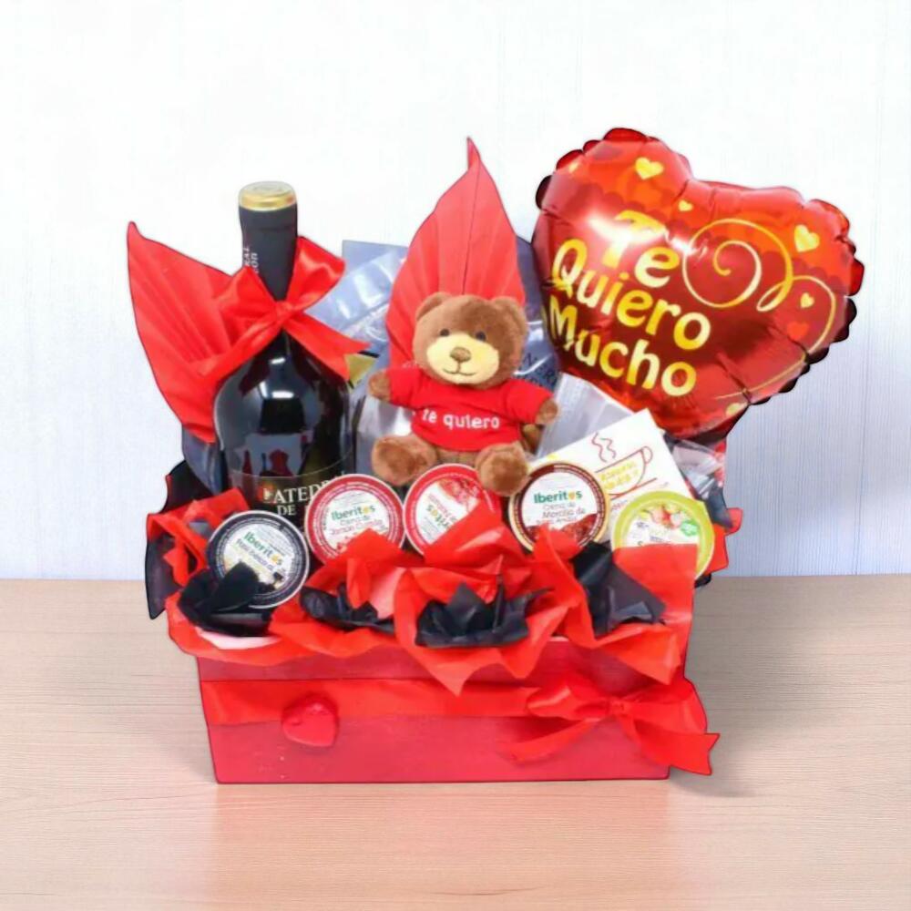 Sorprende a tu pareja este 14 de febrero con la Cesta Ibérica San Valentín, un regalo original y sabroso para los que prefieren los sabores salados. Esta preciosa caja de madera está cuidadosamente decorada en tonos rojo pasión y está pensada para compartir una velada especial llena de sabor, amor y brindis. Incluye una exquisita selección de embutidos ibéricos, patés gourmet Iberitos, y una botella de vino tinto Catedral de León, todo acompañado de un tierno peluche Te Quiero, un globo en forma de corazón y una tarjeta para tu dedicatoria personal. Ideal para disfrutar de una cena romántica sin complicaciones. Un regalo único para decir “Te quiero mucho”... ¡con sabor!