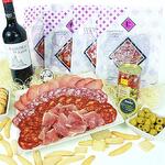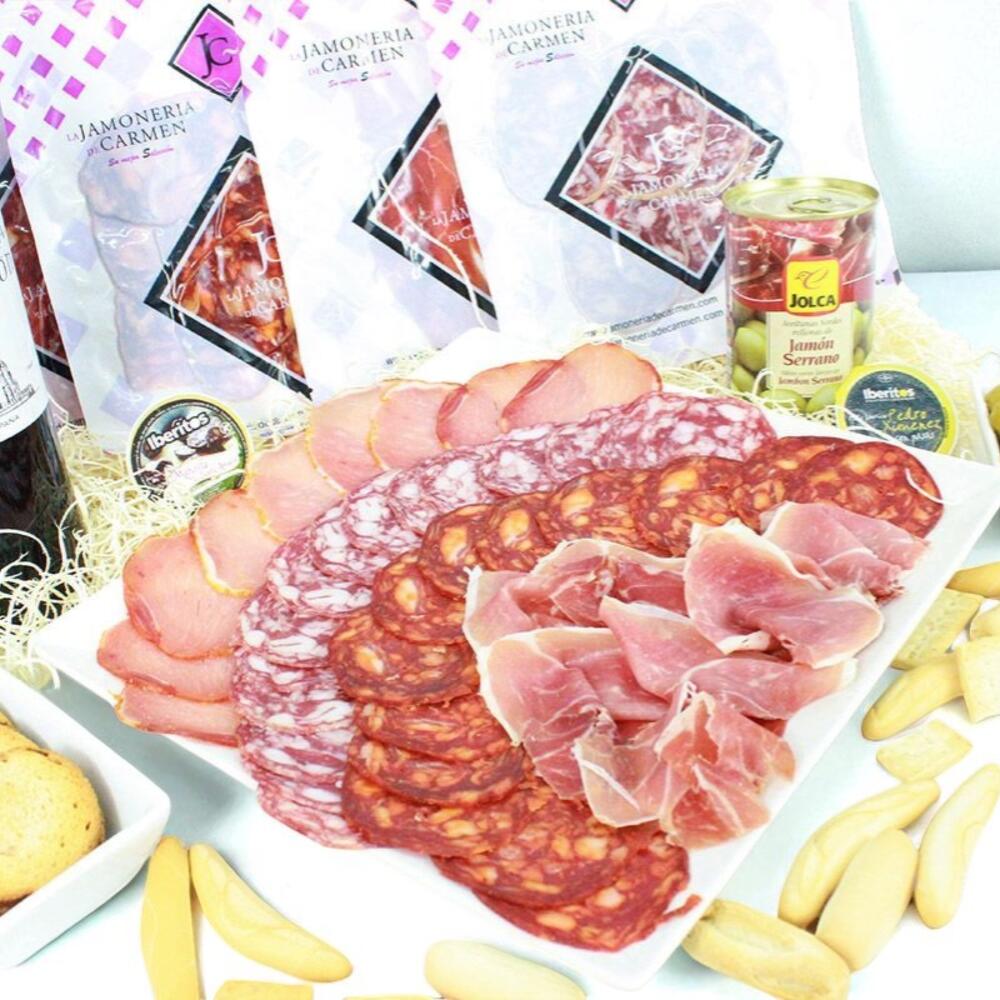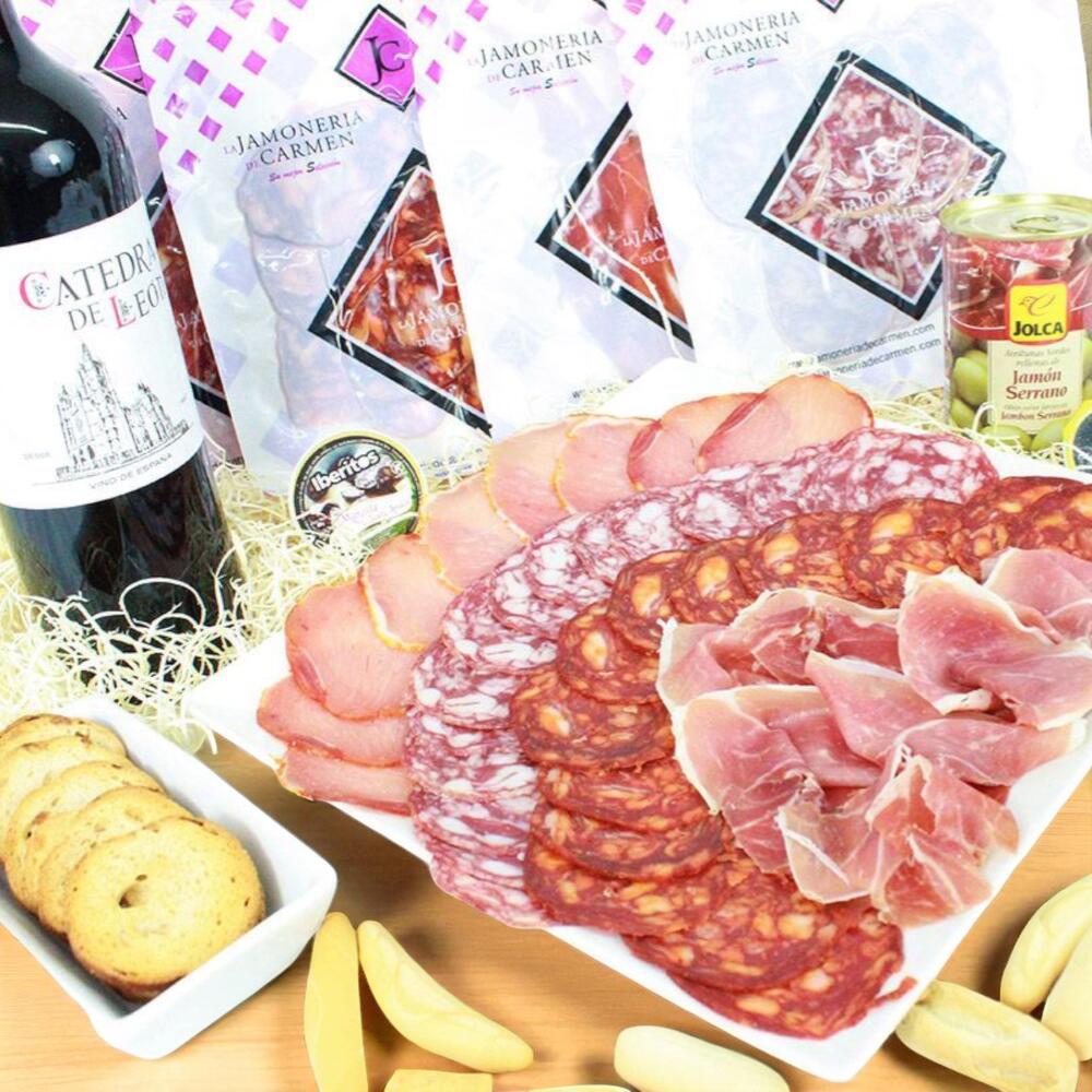 botella de vino tinto - 1 ud. bandeja de mimbre - 1 ud. tarrina de paté al pedro ximénez - 1 ud. loncheado de jamón de bodega - 70 gr tarrina de paté de morcilla santa amalia - 1 ud. loncheado de chorizo ibérico - 70 gr tarjeta regalo - 1 ud. picos y regañas - 1 ud. loncheado de salchichón ibérico - 70 gr loncheado de lomo ibérico - 70 gr tostitas de arandanos - 1 ud. aceitunas rellenas - 130 gr