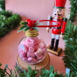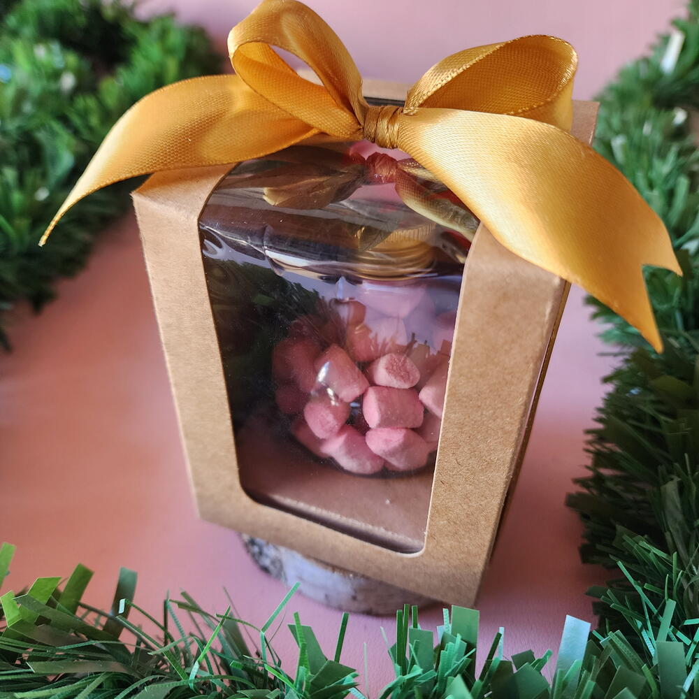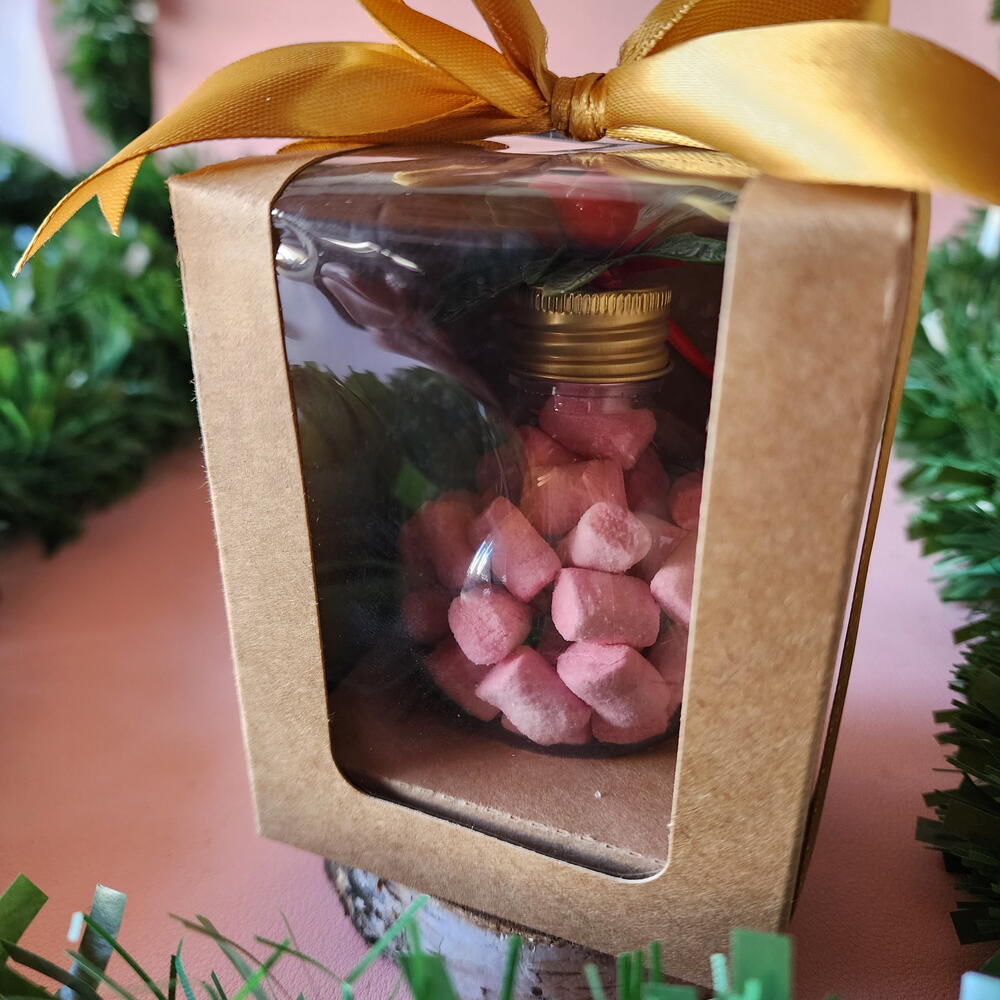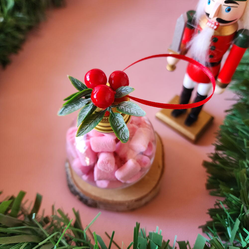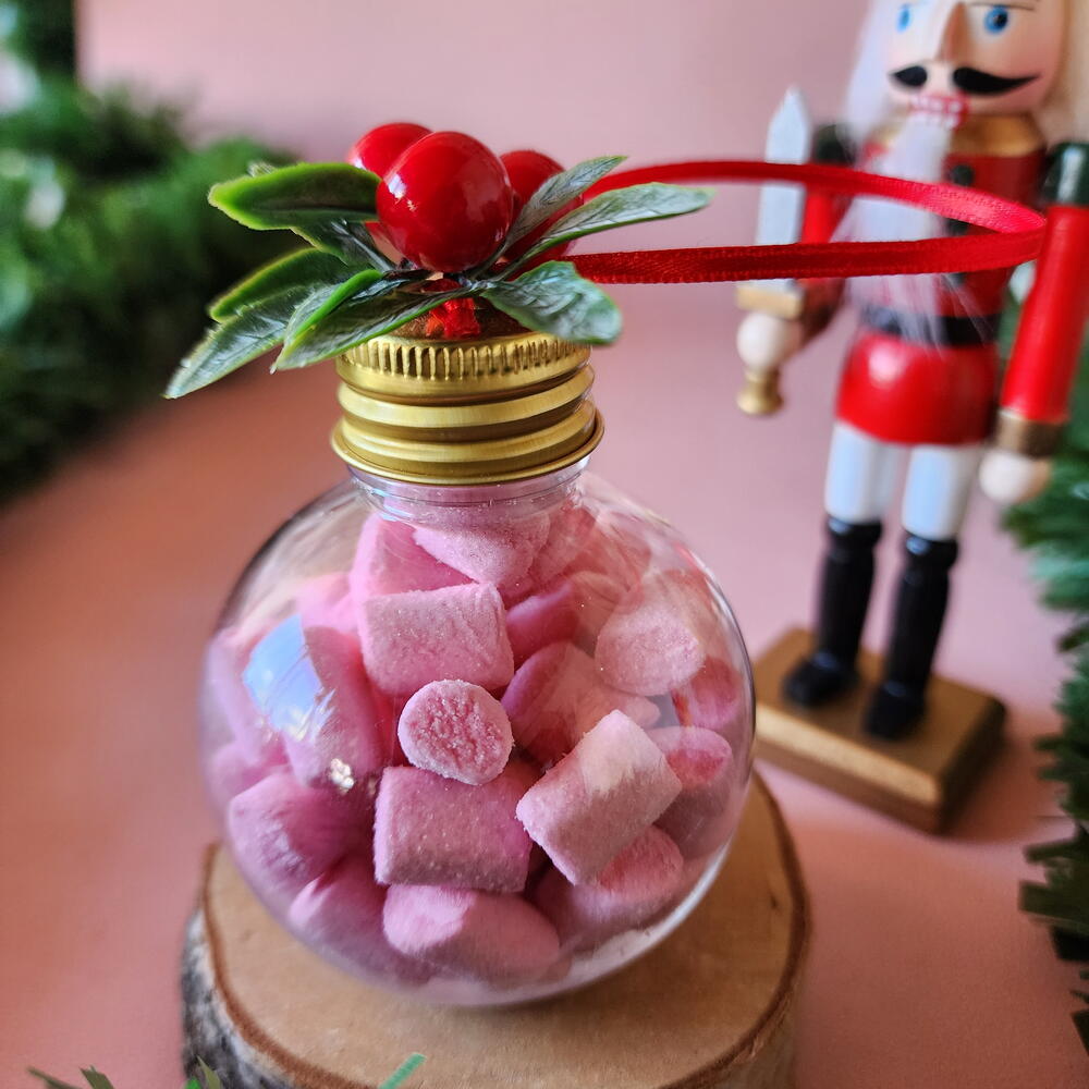 Delicado colgante con forma de esfera, relleno con dulces y decorado con hojas y bayas Navideñas. Perfecto para regalar o para comprar para nuestra familia y colgar del aebolito de navidad.