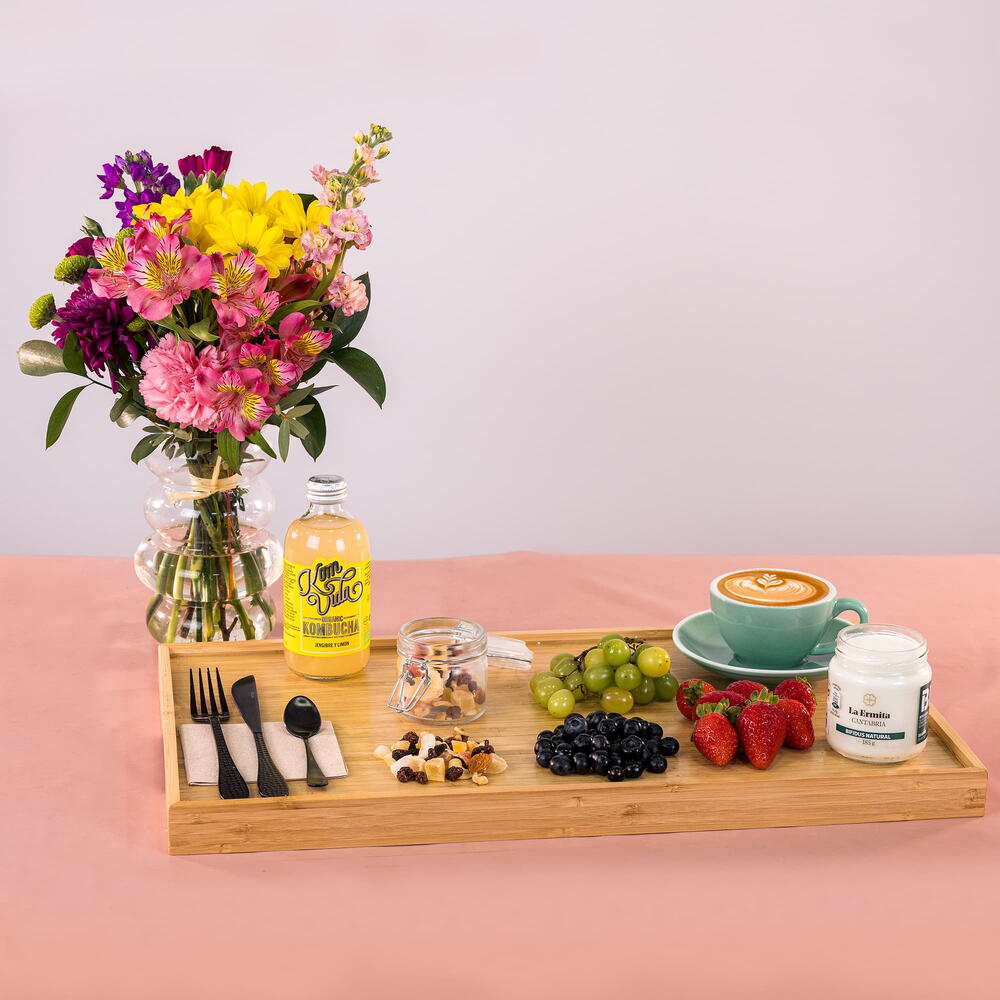 Alstroemeria - 5 ud. crisantemo - 8 ud. fresas - 120 gr clavel rosa - 3 ud. verdes variados - 3 ud. moras - 80 gr uva verde - 150 gr kéfir probiótico - 185 gr mezcla de frutos secos - 40 gr taza térmica con café - 1 ud. caja de presentación - 1 ud. campanillapalillos - 2 ud. kombucha de limón y jengibre - 1 ud.