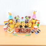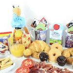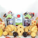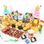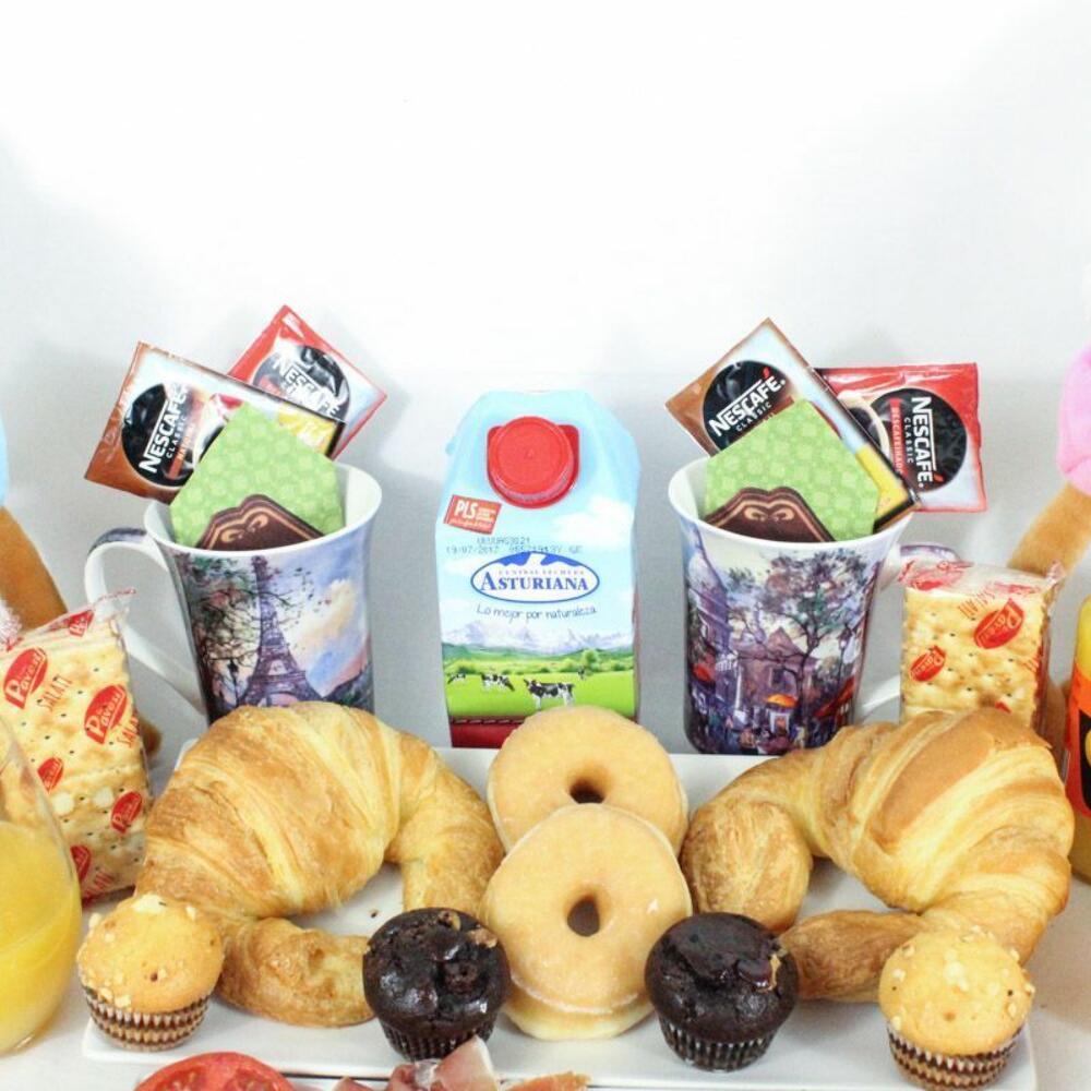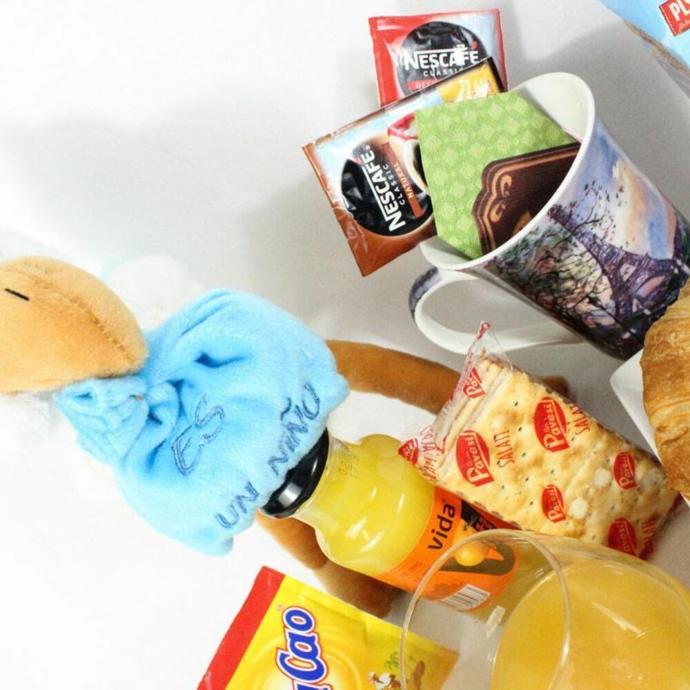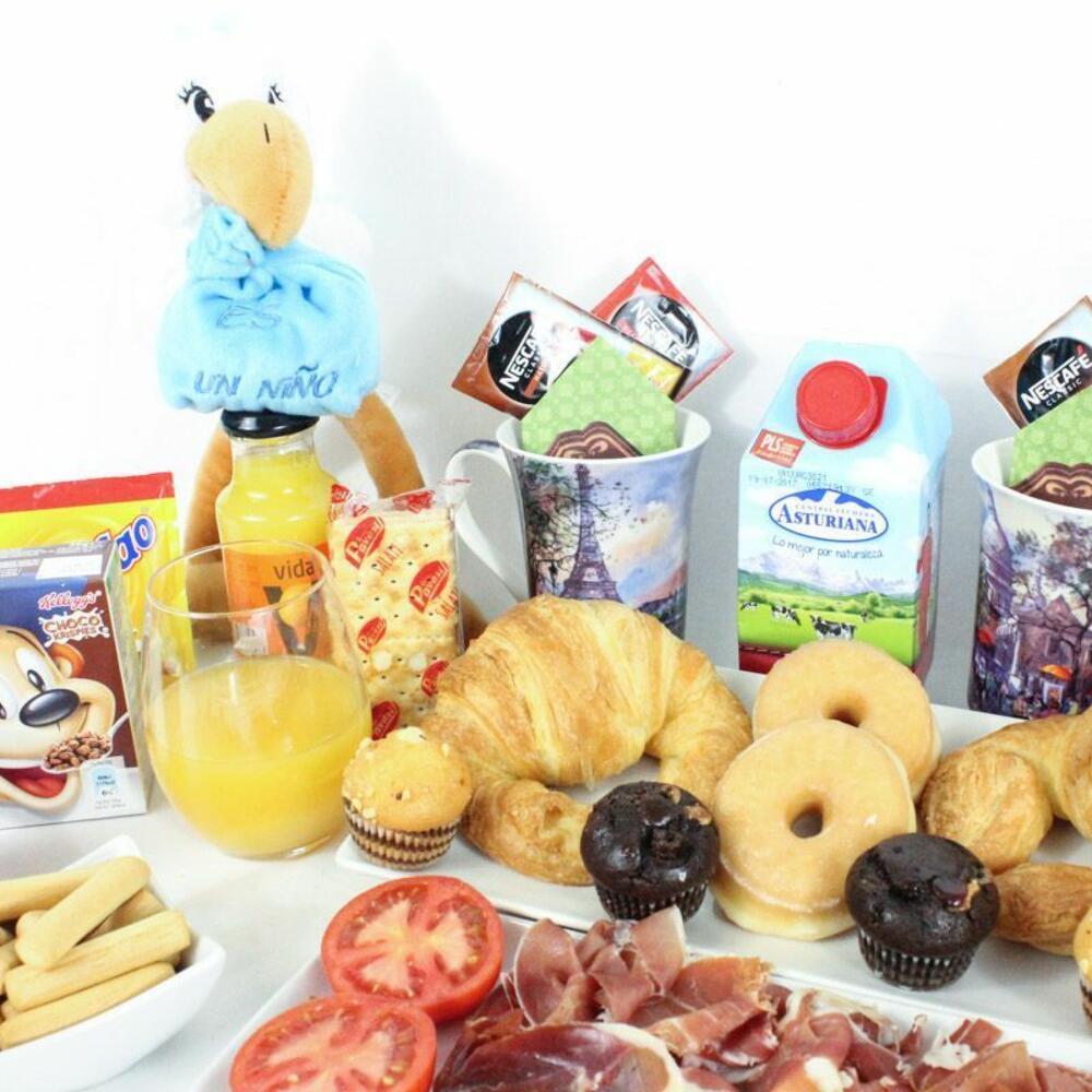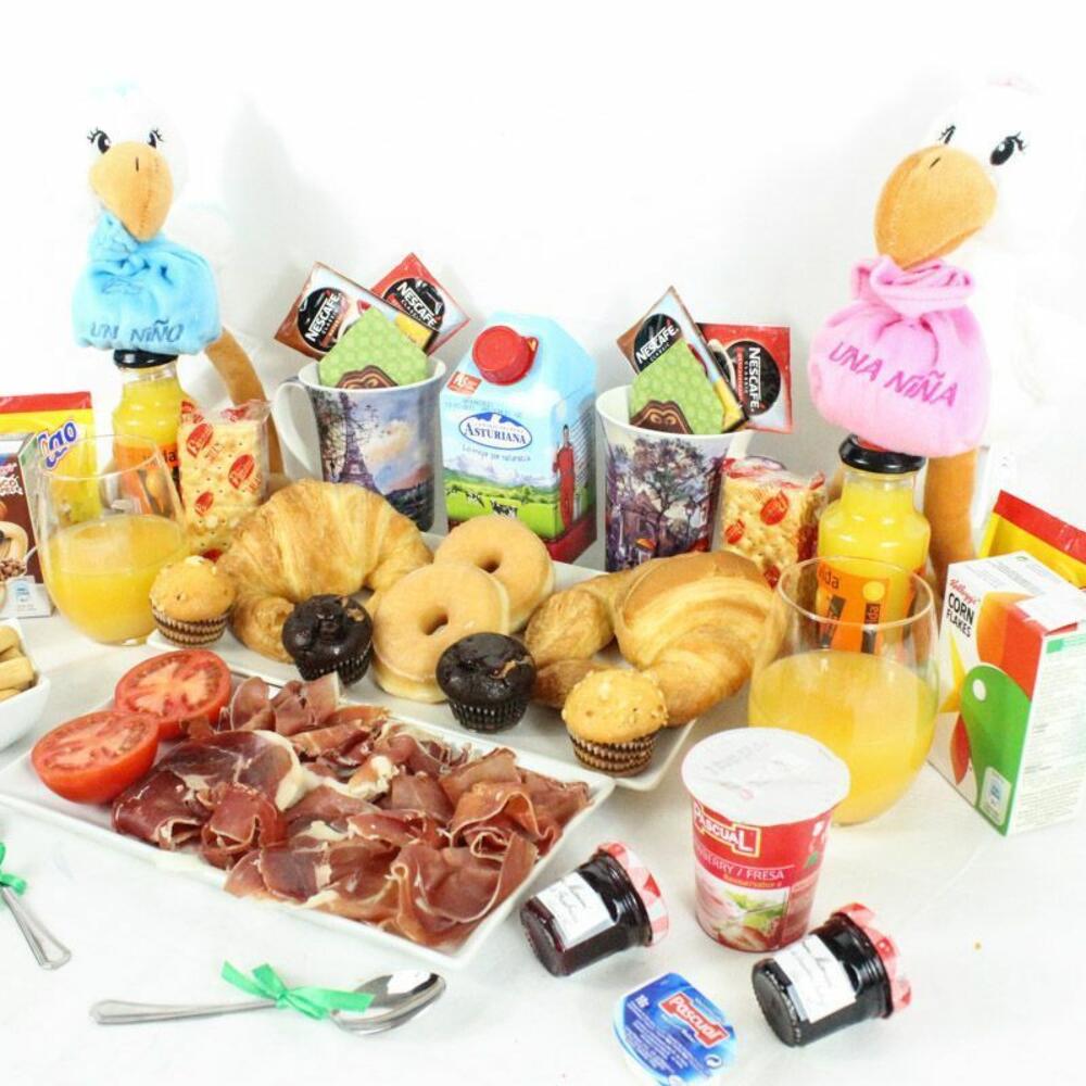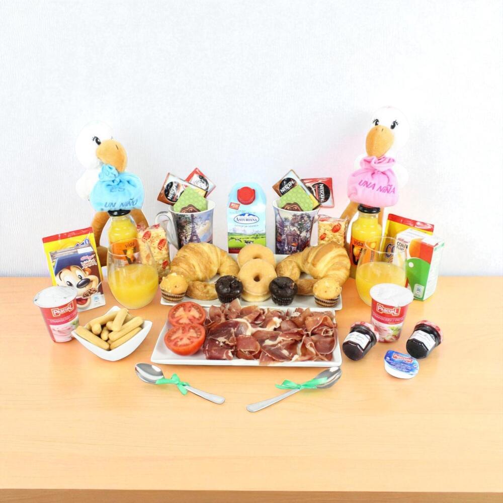 yogurt - 2 ud. mermelada de fresa - 2 ud. croissant - 2 ud. mantequilla - 2 ud. bandeja de mimbre - 1 ud. azúcar - 2 ud. edulcorante - 2 ud. cuchara de acero - 2 ud. sobre de cola cao - 2 ud. caja de cereales - 2 ud. pieza de tomate natural - 2 ud. servilletas de diseño - 2 ud. café descafeinado - 2 ud. mini muffin de manzana y crema - 2 ud. mini muffin de chocolate y fresa - 2 ud. café normal - 2 ud. brick de leche (asturiana) - 500 ml picos y regañas - 2 ud. mini dots classic - 2 ud. jamón de bodega - 120 gr galletitas saladas crackers - 2 ud. peluche cigüeña “es un niño” “es una niña” - 1 ud. taza de porcelana modelo según stock - 2 ud. zumo de naranja ecologíco - 2 ud.