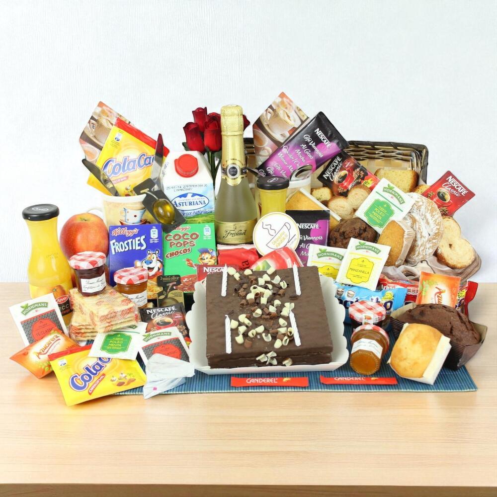mermelada de fresa - 2 ud. taza de porcelana - 2 ud. mantequilla - 2 ud. muffin de chocolate - 2 ud. bandeja de mimbre - 1 ud. cuchara de madera - 2 ud. mermelada de melocotón - 2 ud. galletas maría - 2 ud. azúcar - 2 ud. edulcorante - 2 ud. sobre de cola cao - 2 ud. ensaimada - 2 ud. magdalenas valencianas - 2 ud. palmeritas - 2 ud. servilletas de diseño - 1 ud. nescafé vienés - 2 ud. infusión de menta poleo - 2 ud. infusión de manzanilla - 2 ud. bocaditos - 2 ud. ramo de 6 rosas de madera - 1 ud. café descafeinado - 2 ud. café normal - 2 ud. té clásico - 2 ud. brick de leche central lechera asturiana - 500 ml tarjeta regalo - 1 ud. zumo de naranja ecológico (huerta del sabor) - 2 ud. pieza de fruta - 2 ud. caja de cereales (kelloggs) - 2 ud. bocaditos con chocolate - 2 ud. benjamín de cava freixenet - 1 ud. tarta de tres chocolates o manzana según stock - 1 ud. velas magicasde cumpleaños - 1 ud.