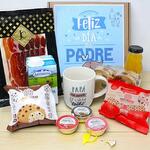rebanadas de pan tostado - 8 ud. loncheado de jamón de bodega reserva - 70 gr iberito de paté ibérico - 1 ud. brick de leche asturiana - 500 ml caja kraf decorada “feliz día del padre” 25*23*9 cm - 1 ud. zumo de naranja ecológico “huerta del sabor” - 1 ud. bolsita de mini cookies - 1 ud. iberito de tomate y aceite - 1 ud. iberito de paté jamón york - 1 ud. taza de porcelana “papa tus abrazos lo curan todo” - 1 ud.