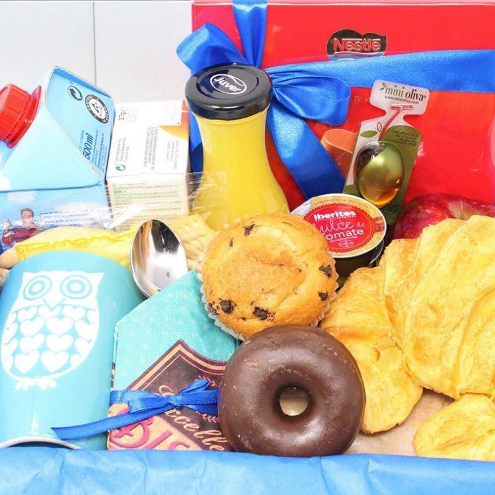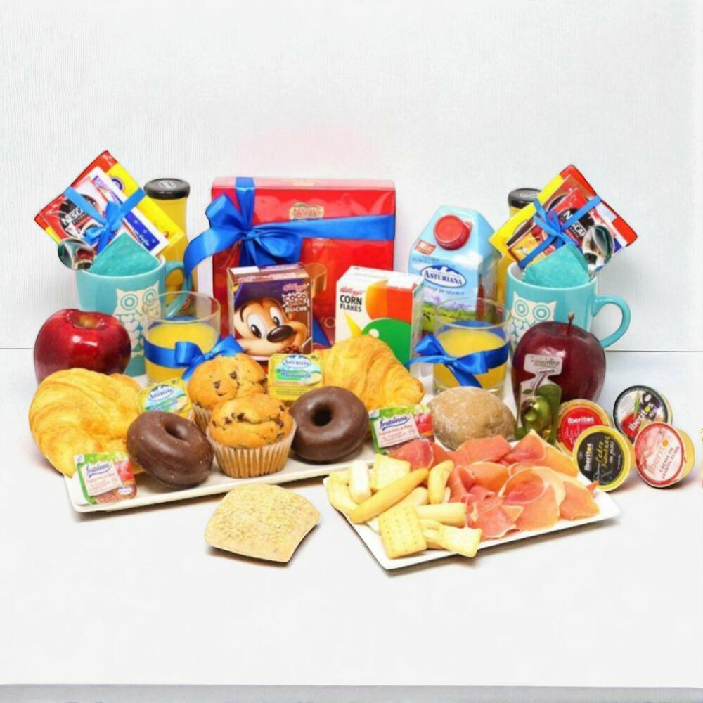 aceite de oliva - 2 ud. mermelada de fresa - 2 ud. taza de porcelana - 2 ud. sobre de azúcar - 2 ud. bandeja de mimbre - 1 ud. sobre de café descafeinado - 2 ud. croissant de mantequilla - 2 ud. servilleta de diseño - 2 ud. cuchara de acero - 2 ud. tarrina de mantequilla - 2 ud. sobre de edulcorante - 2 ud. sobre de café natural - 2 ud. sobre de cola cao - 2 ud. caja de cereales - 2 ud. tarrina de tomate triturado dulce - 2 ud. tarrina de jamón york - 2 ud. muffin con pepitas de chocolate - 2 ud. loncheado de jamón de bodega - 120 gr ajo y aceite - 1 ud. tarrina de tomate - 1 ud. mini dot de chocolate - 2 ud. brick de leche central lechera asturiana - 500 ml picos y regañas - 2 ud. zumo de naranja ecológico (huerta del sabor) - 2 ud. tarrina de paté al pedro ximenez - 2 ud. pieza de fruta - 2 ud. mini ciabatta - 2 ud. caja de bombones nestle 100g - 1 ud.