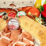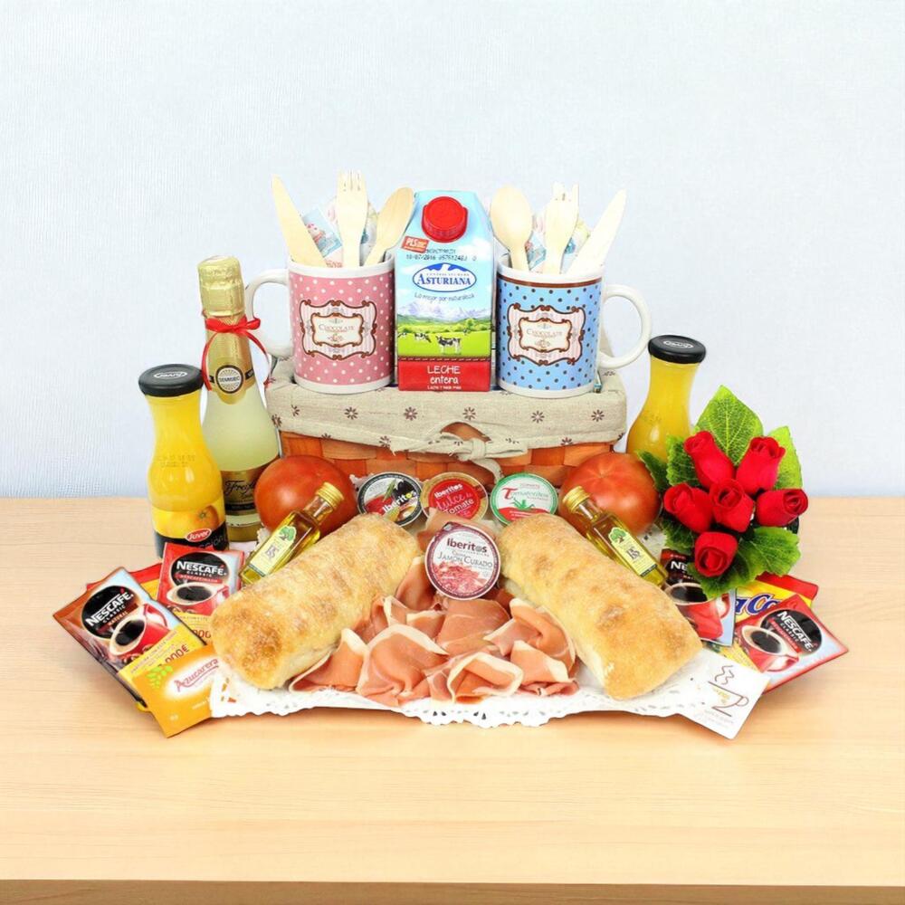 cuchara de madera - 2 ud. taza de porcelana (modelo según disponibilidad) - 2 ud. cuchillo de madera - 2 ud. azúcar - 2 ud. edulcorante - 2 ud. servilleta de diseño - 2 ud. sobre de cola cao - 2 ud. brick de leche central lechera asturiana (500 ml) - 1 ud. botellita de aceite de oliva virgen extra - 2 ud. benjamín de cava - 1 ud. bandeja de mimbre decorada - 1 ud. zumo de naranja ecológico huerto del sabor (botella de cristal) - 2 ud. jamón curado - 120 gr tarrina de tomate natural - 2 ud. tarrina de crema de jamón curado - 2 ud. pieza de tomate fresco natural - 2 ud. panecillos rústicos estilo chapata - 2 ud. café natural nescafé - 2 ud. café descafeinado nescafé - 2 ud. ramo de rosas de madera rojas - 1 ud. iberito de ajo y aceite - 2 ud.