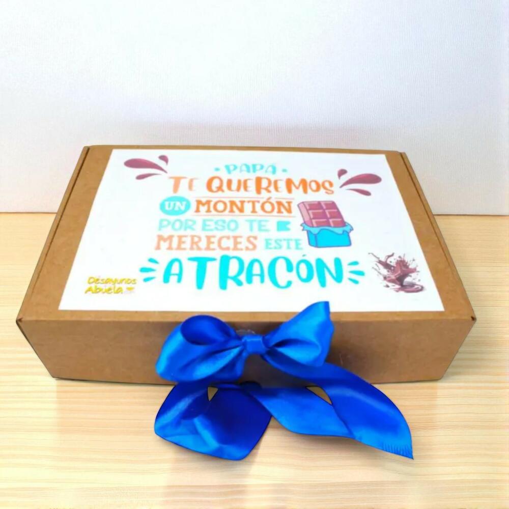 beignet de chocolate - 4 ud. mini muffins de chocolate con mermelada de fresa - 4 ud. mini muffins de vainilla y manzana - 4 ud. tarjeta regalo - 1 ud. mini dots classic - 3 ud. caja kraf personalizada “papa te queremos un montón por esos te mereces un atracón” - 1 ud. mini dots chocolate - 3 ud. mini gofre con chocolate - 3 ud.