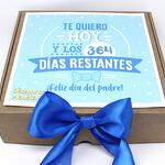 tarjeta regalo - 1 ud. zumo de naranja ecológico ( huerta del sabor) - 1 ud. caja kraf personalizada “te quiero hoy y los 364 días restantes” - 1 ud. taza “papá eres el gps de mi vida” - 1 ud. café con leche arabico - 1 ud. mini dog classic - 3 ud. mini dog chocolate - 3 ud. chocolatina “feliz día papa” - 1 ud. bote de gominolas “besitos para el mejor papa” - 1 ud.