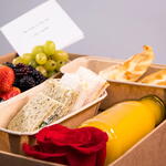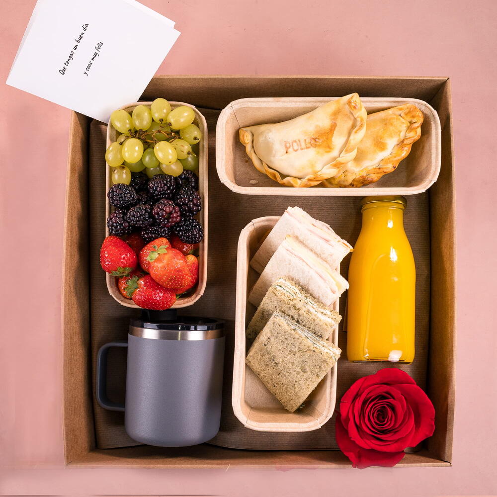 Solidago - 2 ud. craspedia - 1 ud. paniculata - 1 ud. fresas - 120 gr verdes variados - 3 ud. rosa naranja - 6 ud. moras - 80 gr statice morado - 2 ud. crisantemo amarillo - 4 ud. zumo de naranja - 250 ml tomate cherry - 6 ud. uva verde - 150 gr taza térmica con café - 1 ud. empanadas de pollo - 2 ud. sándwiches surtidos - 6 ud. rosa roja de caja - 1 ud.