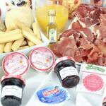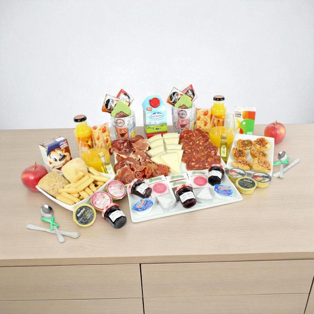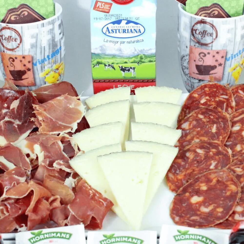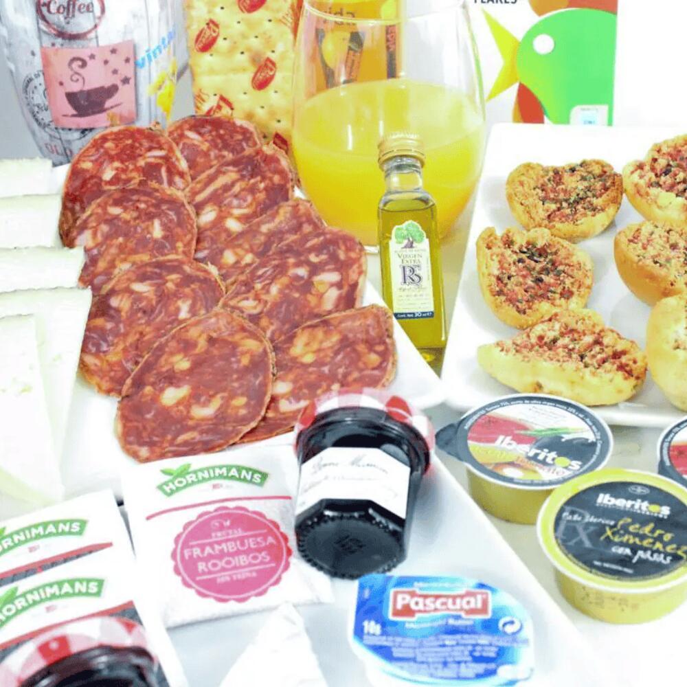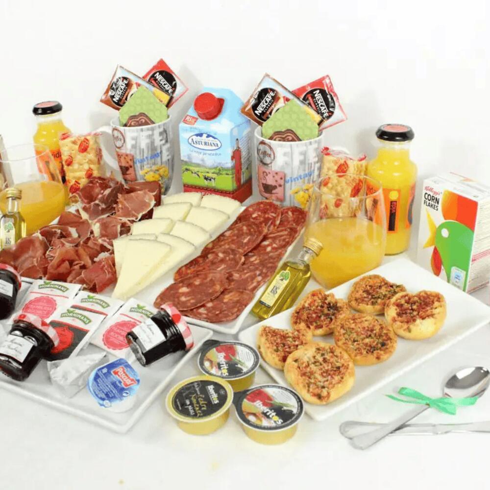 mermelada de fresa - 2 ud. sobre de azúcar - 2 ud. cuchara de madera - 2 ud. servilleta decorativa - 2 ud. sobre de café normal - 2 ud. sobre de café descafeinado - 2 ud. tarrina de mantequilla - 2 ud. sobre de edulcorante - 2 ud. brick de leche central lechera asturiana (500 ml) - 1 ud. botellita de aceite de oliva virgen extra - 2 ud. ración de picos y regañás - 2 ud. loncheado de jamón de bodega - 120 gr ajo y aceite - 1 ud. tarrina de tomate - 1 ud. loncheado de chorizo ibérico - 70 gr crema de paté al pedro ximénez - 2 ud. crema de jamón york - 2 ud. caja de cereales tipo kelloggs - 2 ud. pieza de fruta fresca (manzana o similar) - 2 ud. té clásico - 2 ud. té de frambuesa - 2 ud. cuña de queso curado - 250 gr panecillos de ajo tomate y orégano - 2 ud. taza de porcelana modelo según stock - 2 ud. crackers salados - 2 ud. mini ciabatta - 2 ud. zumo de naranja natural eocologico - 2 ud.