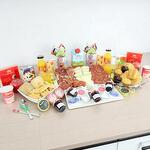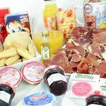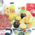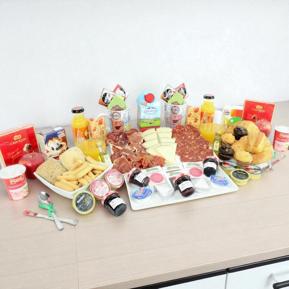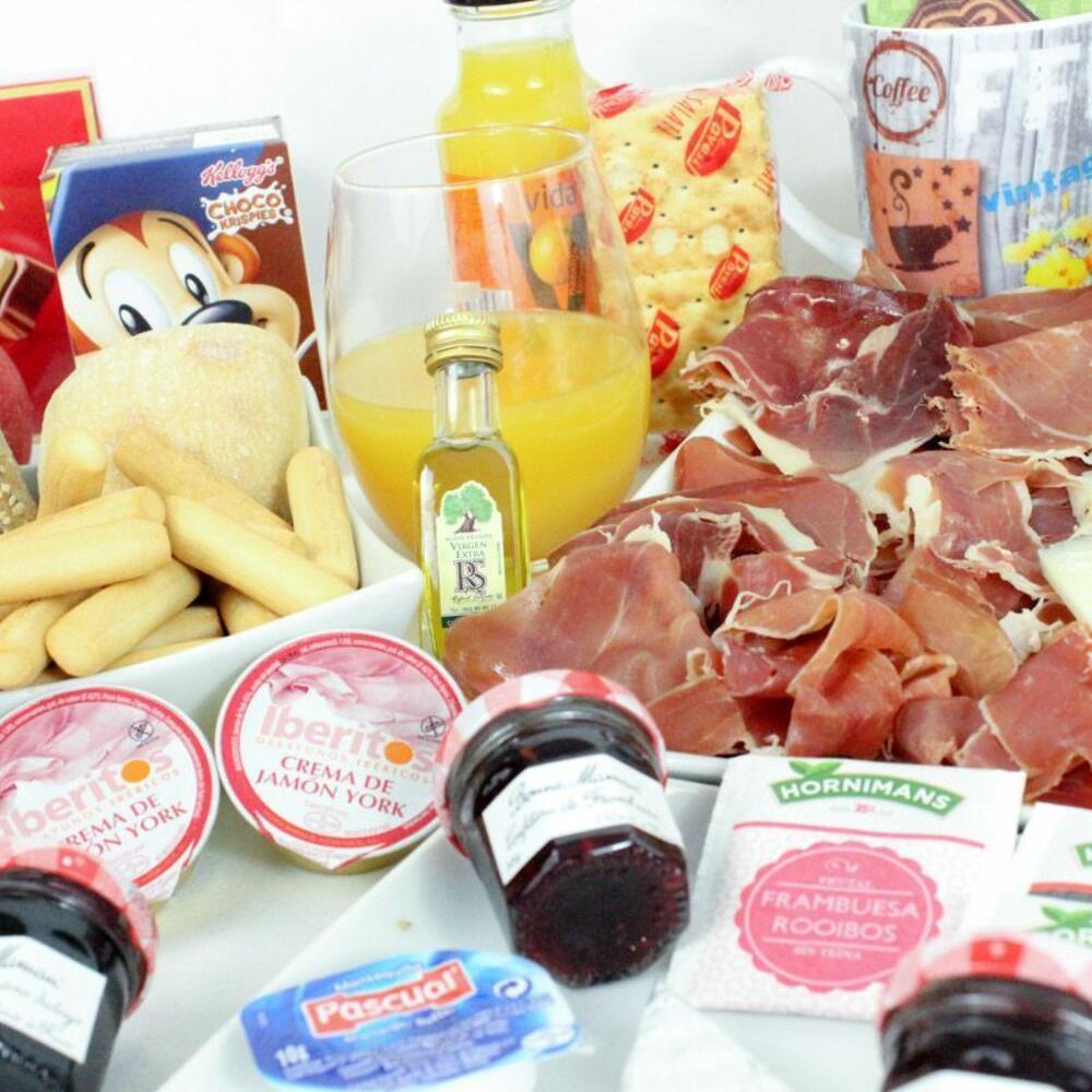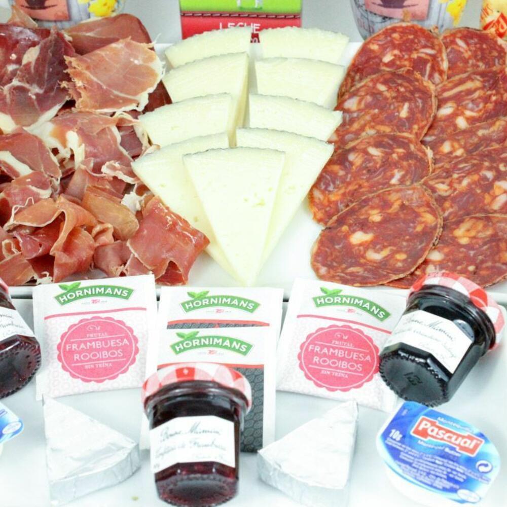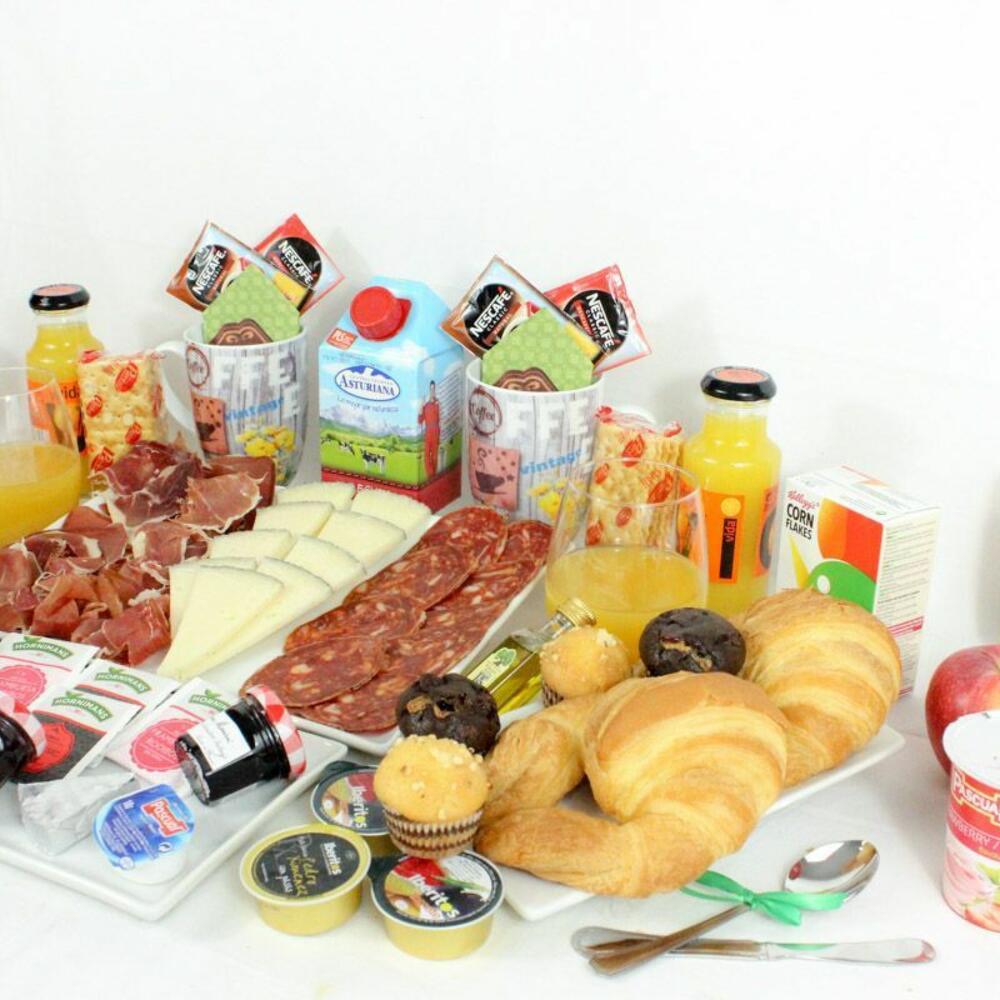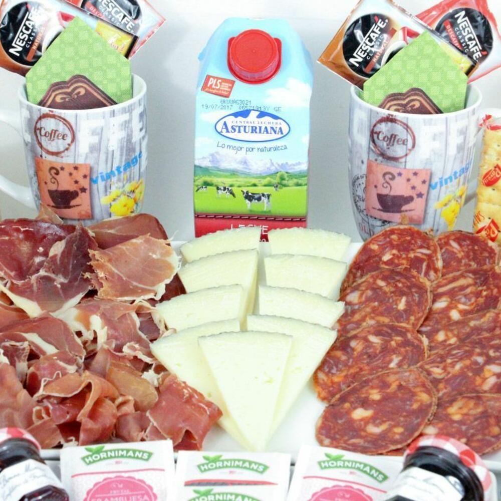 cuña de queso - 250 gr yogurt - 2 ud. mermelada de fresa - 2 ud. taza de porcelana - 2 ud. mantequilla - 2 ud. bandeja de mimbre - 1 ud. cuchara de madera - 2 ud. azúcar - 2 ud. edulcorante - 2 ud. croissant de mantequilla - 2 ud. caja de cereales - 2 ud. loncheado de jamón de bodega - 120 gr ajo y aceite - 1 ud. tarrina de tomate - 1 ud. servilletas de diseño - 2 ud. café descafeinado - 2 ud. tarrina de crema de jamón york - 2 ud. café normal - 2 ud. té de frambuesa - 2 ud. brick de leche (asturiana) - 500 ml picos y regañas - 2 ud. caja de bombones nestle - 2 ud. pieza de fruta - 2 ud. té classic - 2 ud. loncheado de chorizo iberico - 2 ud. tarrina de crema de pate al pedro ximenez - 2 ud. galletitas saladas crakers - 2 ud. mini muffín de manzana y crema - 2 ud. zumo de naranja ecológico huerto del sabor - 2 ud. mini ciabattas - 2 ud. mini muffín de chocolate relleno de mermelada de fresa - 2 ud.