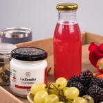 fresas - 120 gr rosa blanca - 6 ud. moras - 80 gr uva verde - 150 gr kéfir probiótico - 185 gr mezcla de frutos secos - 40 gr taza térmica con café - 1 ud. zumo natural rojo - 250 ml