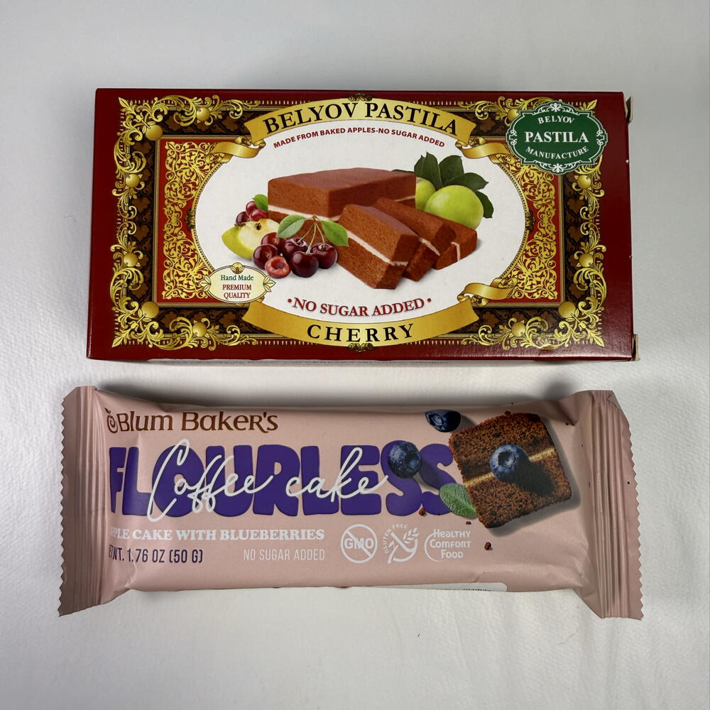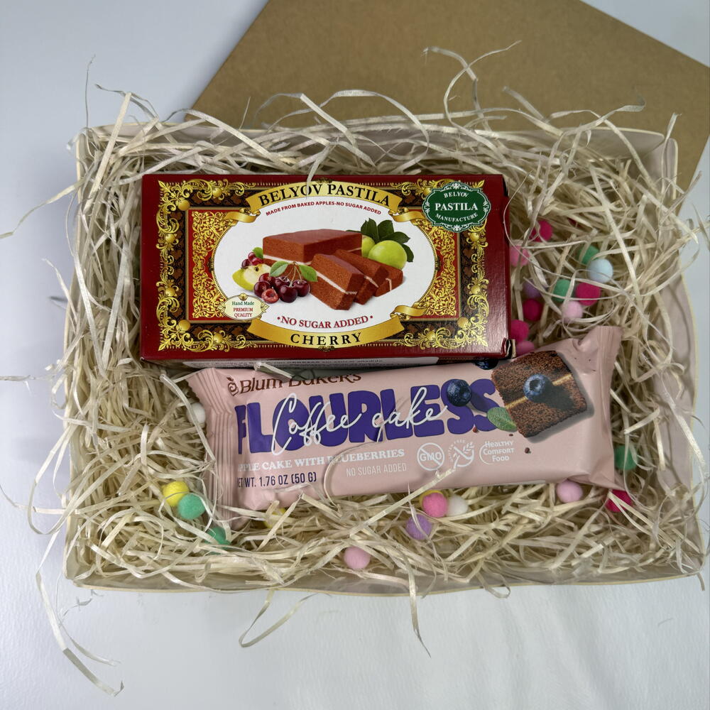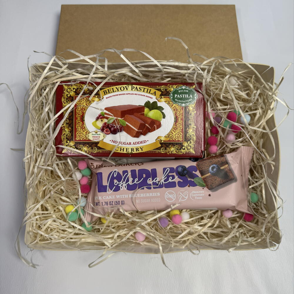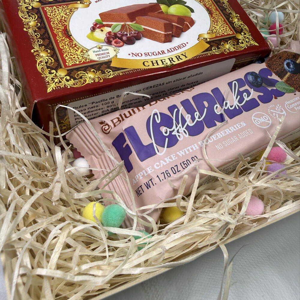 Caja regalo de dulces saludables sin azúcar ni harina. Un detalle dulce, natural y ligero. Incluye: • Dulce tipo bizcocho sabor cereza – 100 g • Barrita de fruta sin azúcar añadido – 50 g Elaborados con solo 3 ingredientes naturales: manzana, clara de huevo y frutas. Sin azúcar añadido. Sin harina. Sin conservantes. Sabor auténtico, textura suave y el placer de disfrutar algo dulce de forma consciente. Perfecto como regalo saludable y diferente.