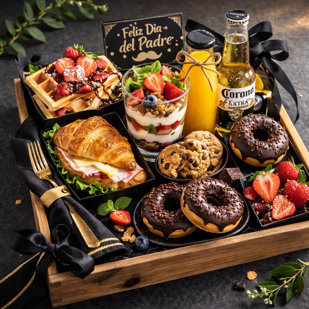 bandeja madera - 1 ud. fresas frescas - 100 gr zumo naranja natural - 1 ud. cookies variadas - 4 ud. croissant salado (jamón y queso) - 1 ud. gofres - 3 ud. cerveza corona extra - 1 ud. paraguay - 1 ud. donuts chocolate - 3 ud.