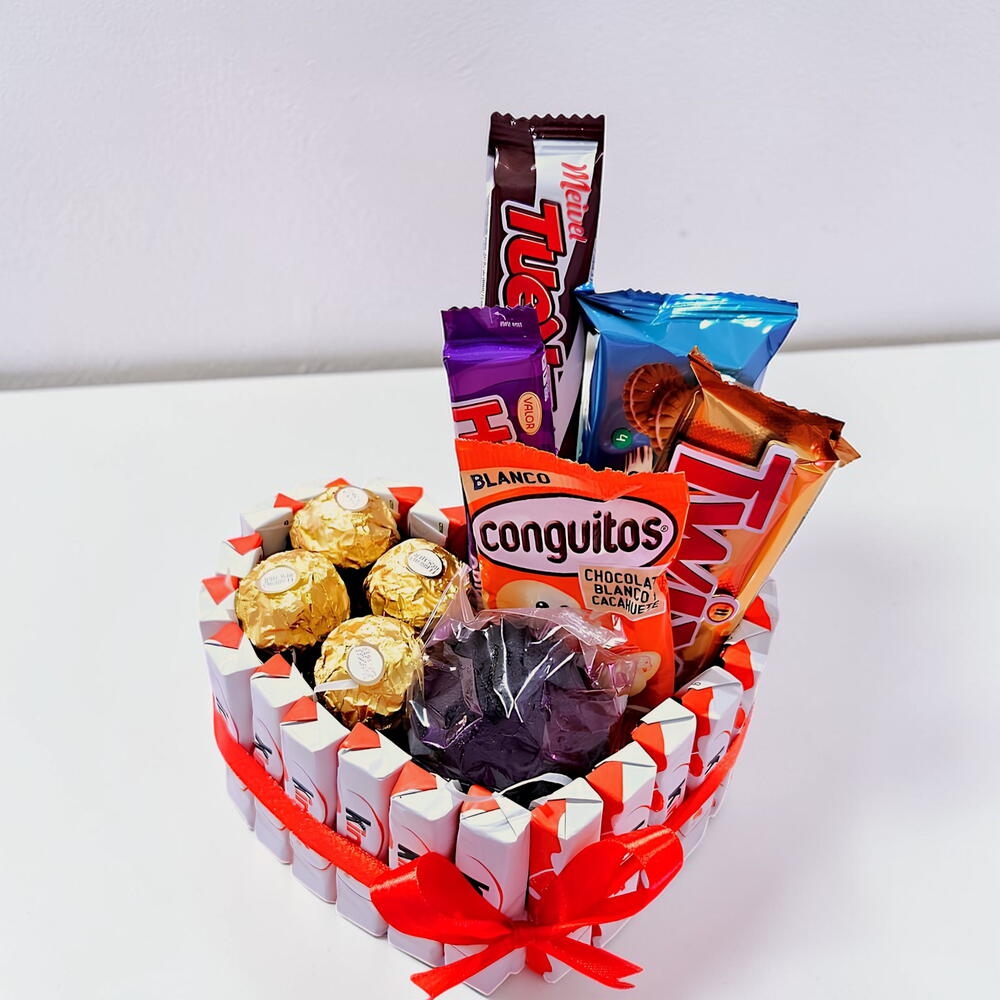 Un hermoso y dulce detalle en forma de corazón que combina lo mejor de los chocolates y golosinas. Este set incluye bombones Ferrero Rocher, barritas de chocolate y una variedad de dulces cuidadosamente seleccionados, todo presentado en un empaque decorativo con lazos rojos que simbolizan amor y cariño. Ideal para sorprender en cualquier ocasión especial, como aniversarios, cumpleaños o el Día de San Valentín.