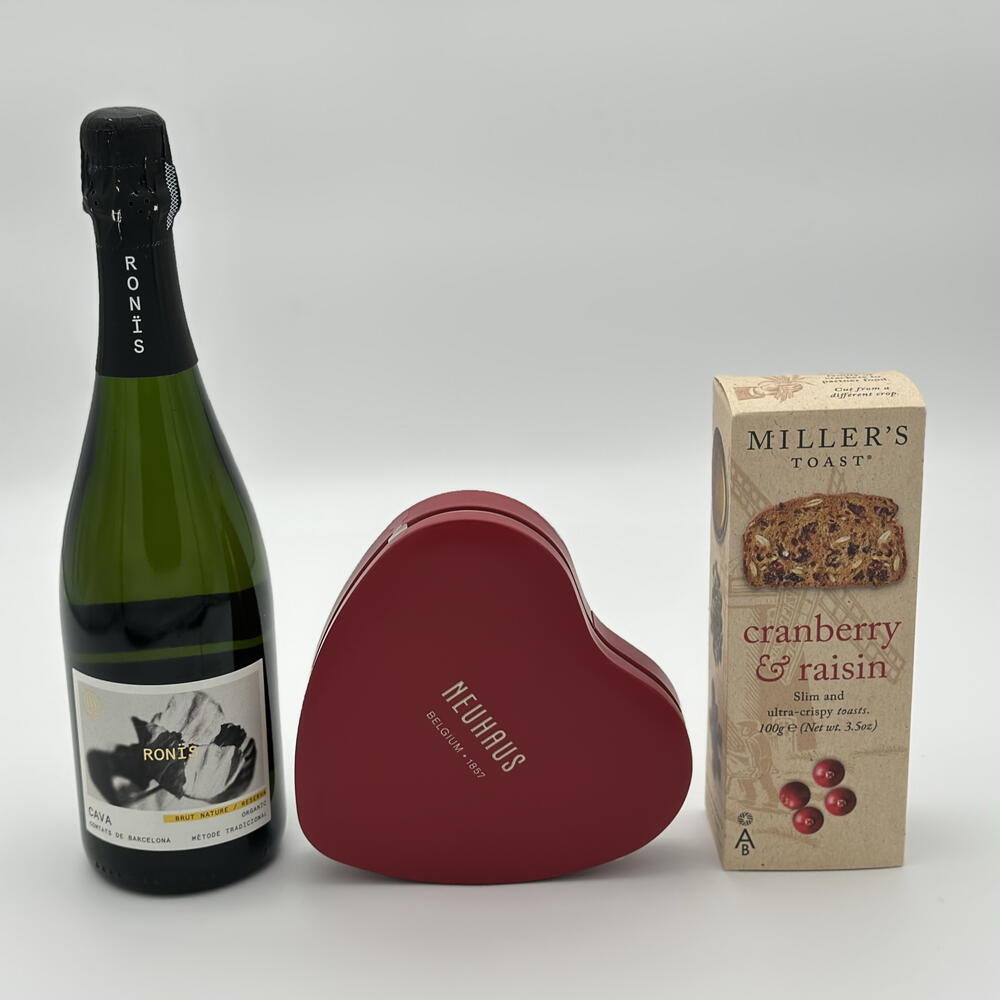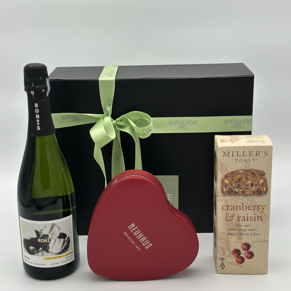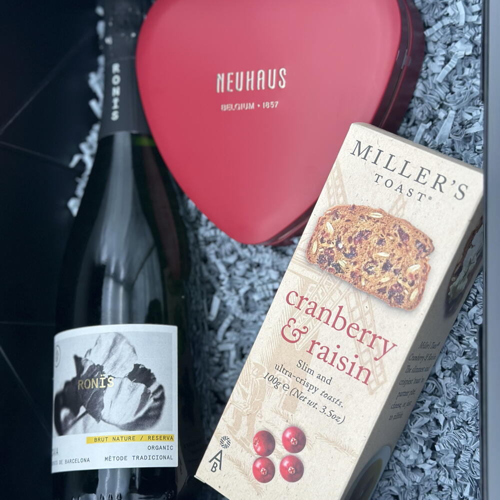 Una cesta de regalo encantadora y elegante diseñada para celebrar los momentos más dulces de la vida. Love in a Box reúne una botella de cava premium Ronis, una caja en forma de corazón con exquisitos bombones belgas Neuhaus y crackers artesanales de arándano y pasas — todo bellamente presentado en una caja de regalo exclusiva. Perfectamente equilibrada entre el deleite y la sofisticación, esta cesta es ideal para ocasiones románticas, aniversarios, cumpleaños, el Día de San Valentín o como un atento regalo de agradecimiento. Una opción intemporal para compartir alegría, amor y celebración en Barcelona y más allá.