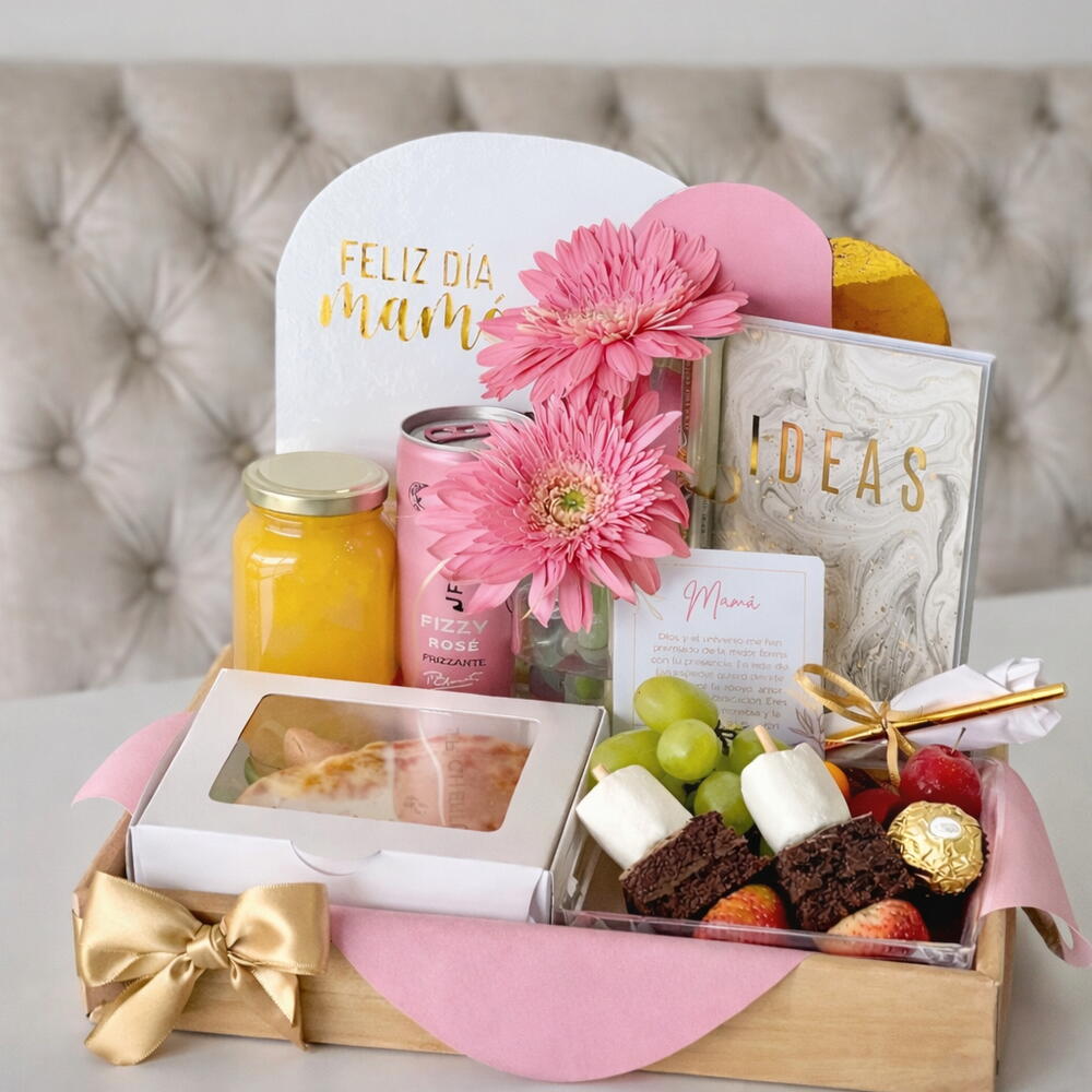 marshmallow - 2 ud. margaritas - 2 ud. fresas - 6 ud. bandeja - 1 ud. uvas - 12 ud. zumo naranja - 250 ml croissant - 1 ud. crepes - 2 ud. brownies mini bandeja - 5 ud. agenda blocnotas - 1 ud. spirit pink bebida - 150 ml tabla decorativa - 1 ud.