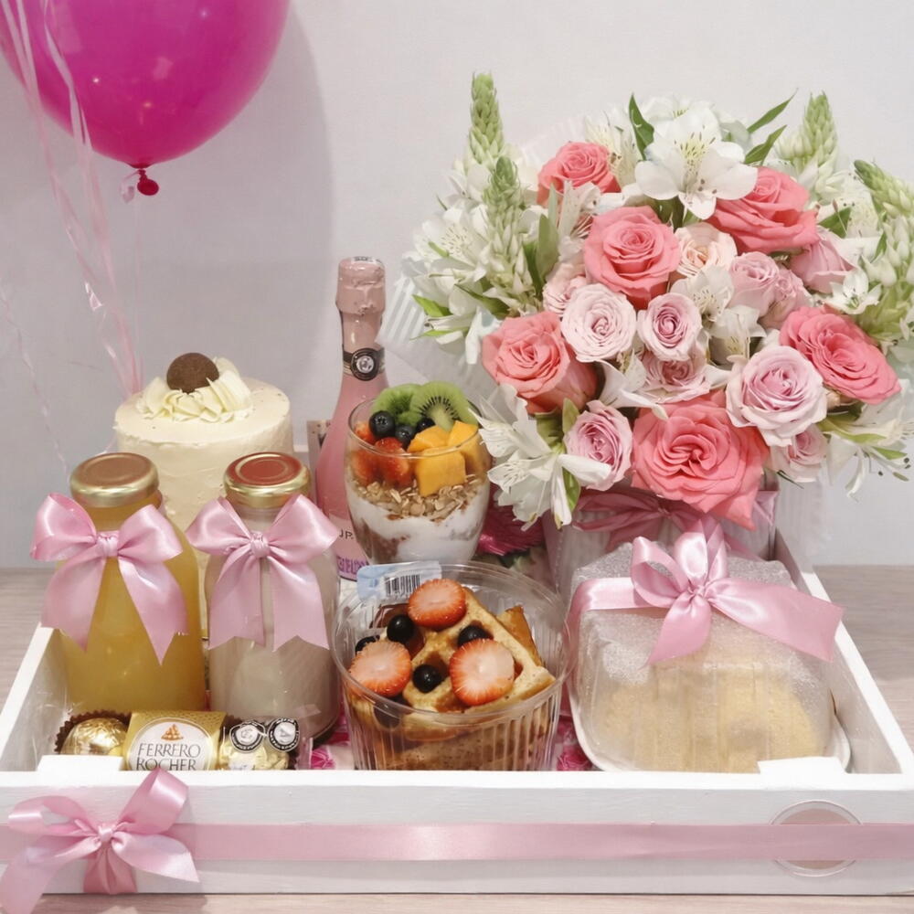 Ferrero rocher - 3 ud. fresas - 8 ud. astromelia - 7 ud. zumo naranja - 250 ml rosas varias - 10 ud. tarta mini blanco decorado con flor natural rosa - 1 ud. croissant salado (jamón y queso) - 1 ud. gofres - 3 ud. parfait con granola - 1 ud. cava mini - 1 ud. flores ramo - 1 ud. cacao late - 1 ud. botes - 2 ud.