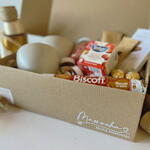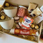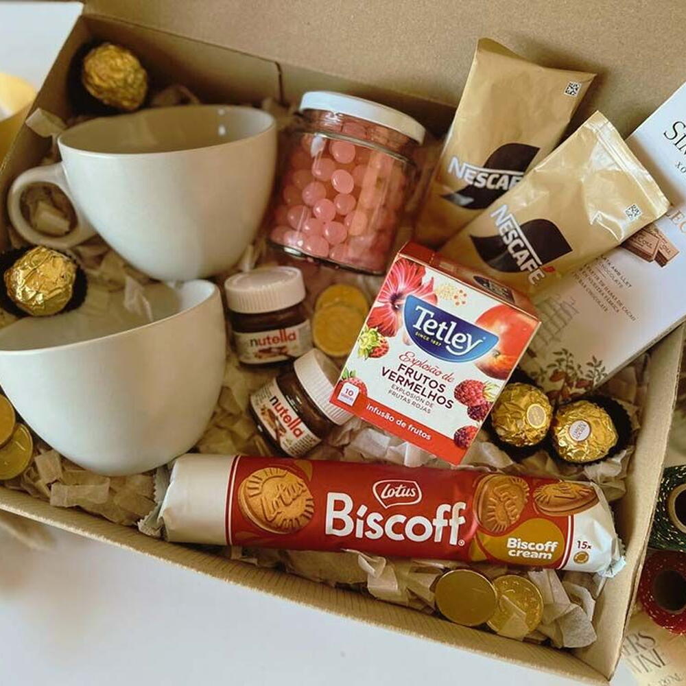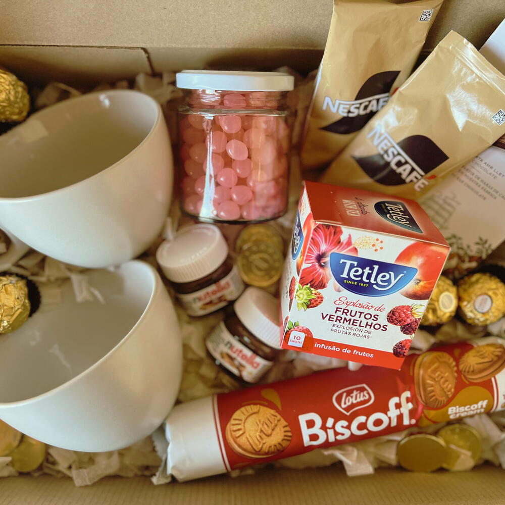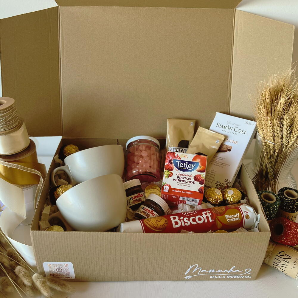 mini nutella - 2 ud. bombones ferrero rocher - 4 ud. tazas tazones - 2 ud. tableta de chocolate simón coll - 1 ud. paquete de galletas biscoff - 1 ud. frasco relleno con cereal bañado en chocolate - 1 ud. caja de té tetley (10 saquitos) - 1 ud. sobres de café nescafé - 2 ud.