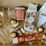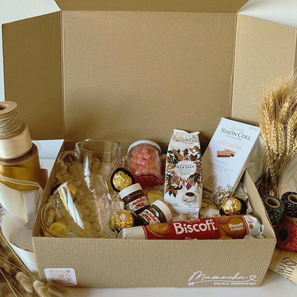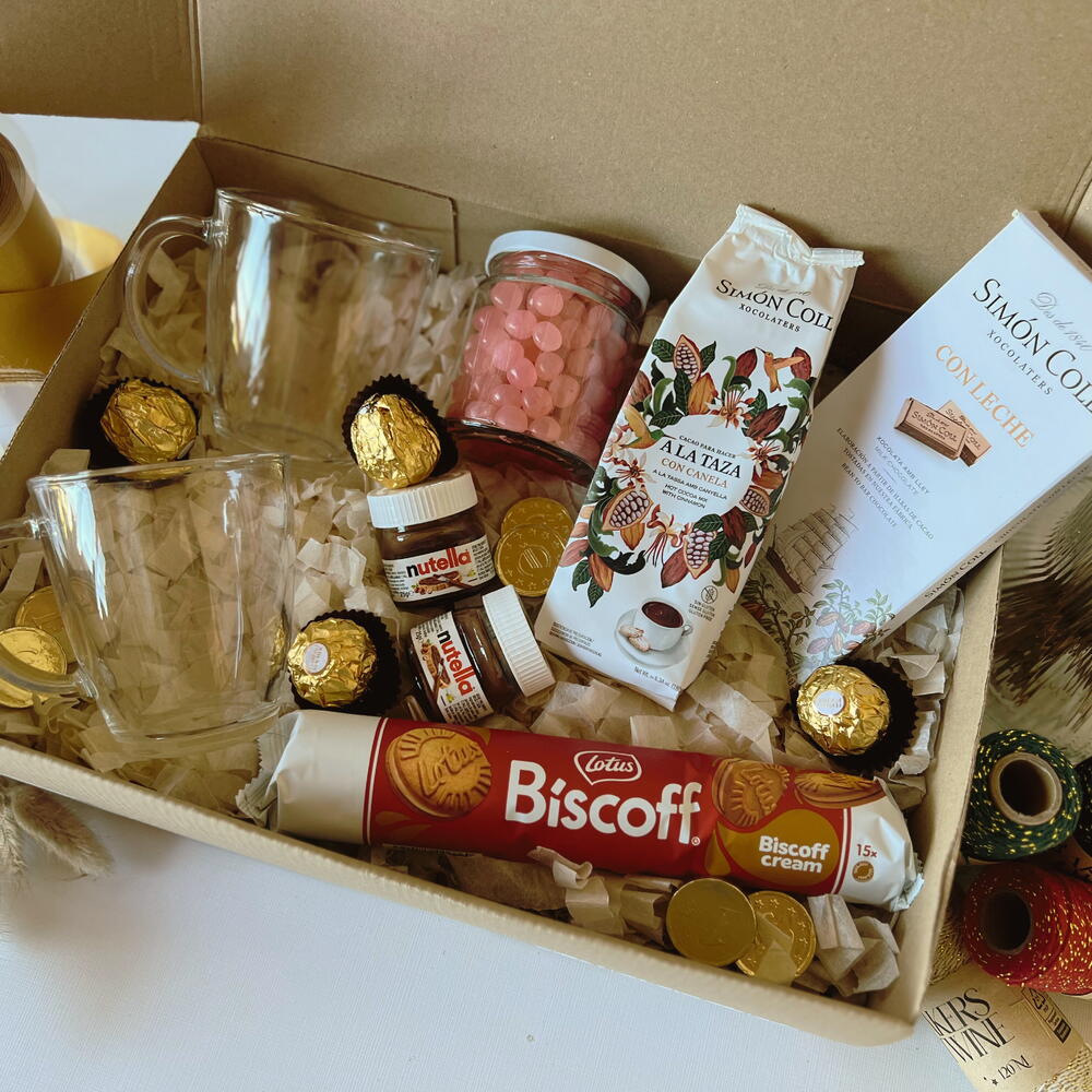 mini nutella - 2 ud. bombones ferrero rocher - 4 ud. paquete de chocolate en polvo simón coll - 1 ud. tableta de chocolate simón coll - 1 ud. paquete de galletas biscoff - 1 ud. frasco relleno con cereal bañado en chocolate - 1 ud. tazas transparentes - 2 ud.