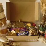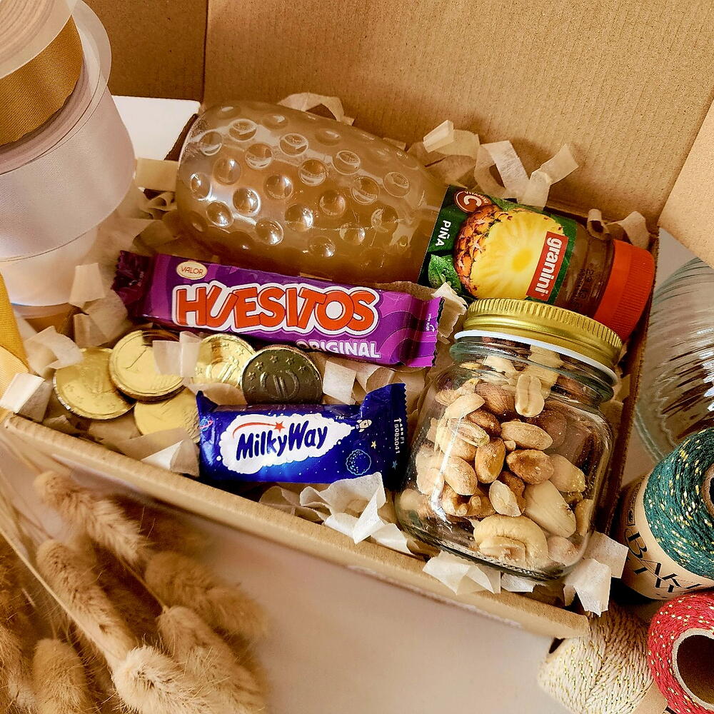 Una cajita pensada para quienes quieren un detalle pequeño, rico y práctico. Ideal para regalar en el trabajo, para acompañar una nota de agradecimiento o para sorprender a alguien “porque sí”. Trae un zumo Granini, un Huesitos, un mini Milky Way y un frasco pequeño de frutos secos con frase motivacional. Un equilibrio perfecto entre dulce, energía y cariño.