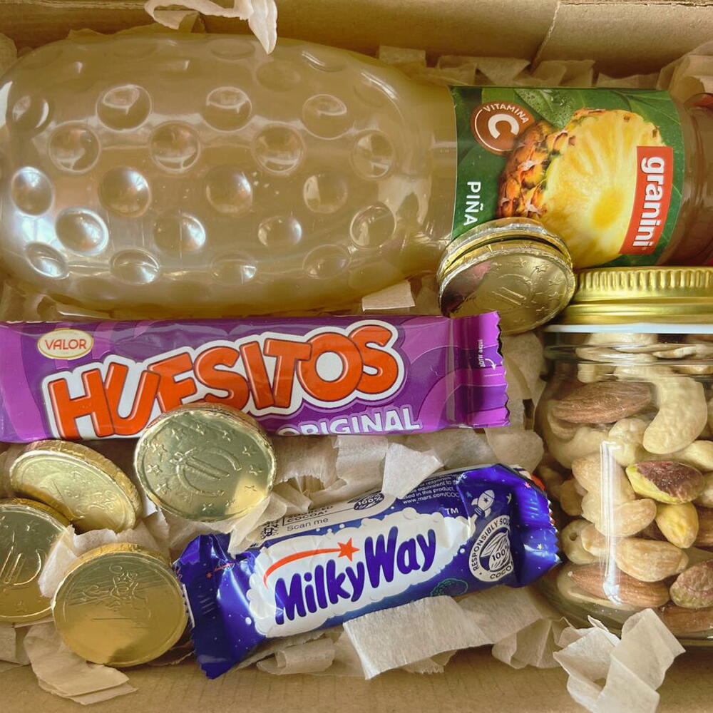 huesitos - 1 ud. botellita de zumo granini de 330cl - 1 ud. mini milky way - 1 ud. pequeño frasco relleno de frutos secos - 1 ud. monedas de chocolate - 5 ud.