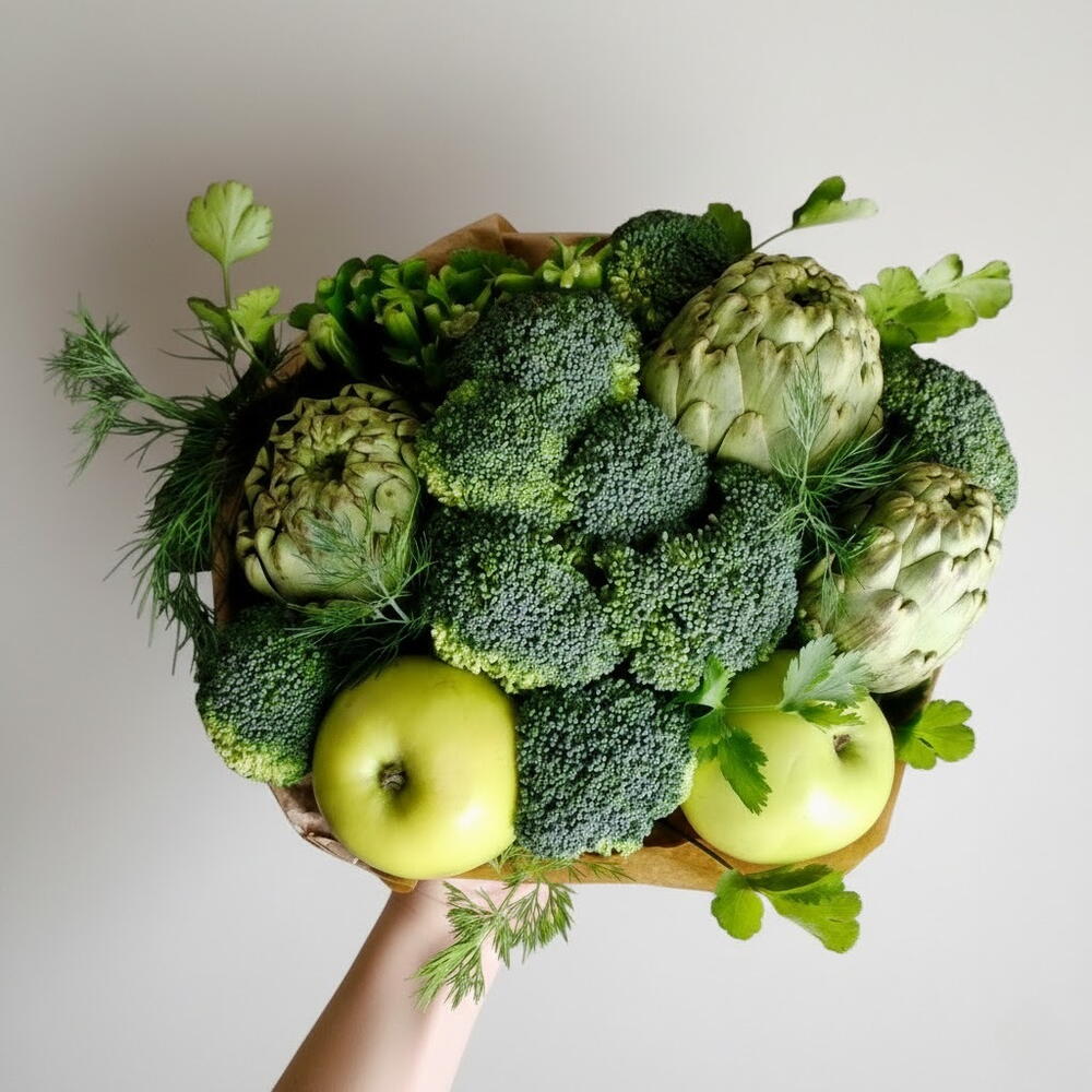 Una explosión de frescura y salud en un solo ramo. Este elegante arreglo combina lo mejor de la huerta: brócoli crujiente, alcachofas frescas, y manzanas verdes, todo decorado con un toque de hierbas aromáticas como perejil y eneldo. Perfecto para sorprender con un detalle ecológico, saludable y totalmente comestible. Ideal para regalar a amantes de la cocina saludable, chefs o simplemente como un centro de mesa original. Conservar en un lugar fresco y fuera del sol directo. El brócoli y la alcachofa pueden durar hasta 4 días si se mantienen refrigerados. Las manzanas deben consumirse antes de los 5 días. Rocía ligeramente las verduras con agua si deseas alargar su frescura.