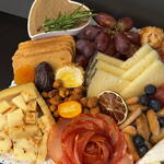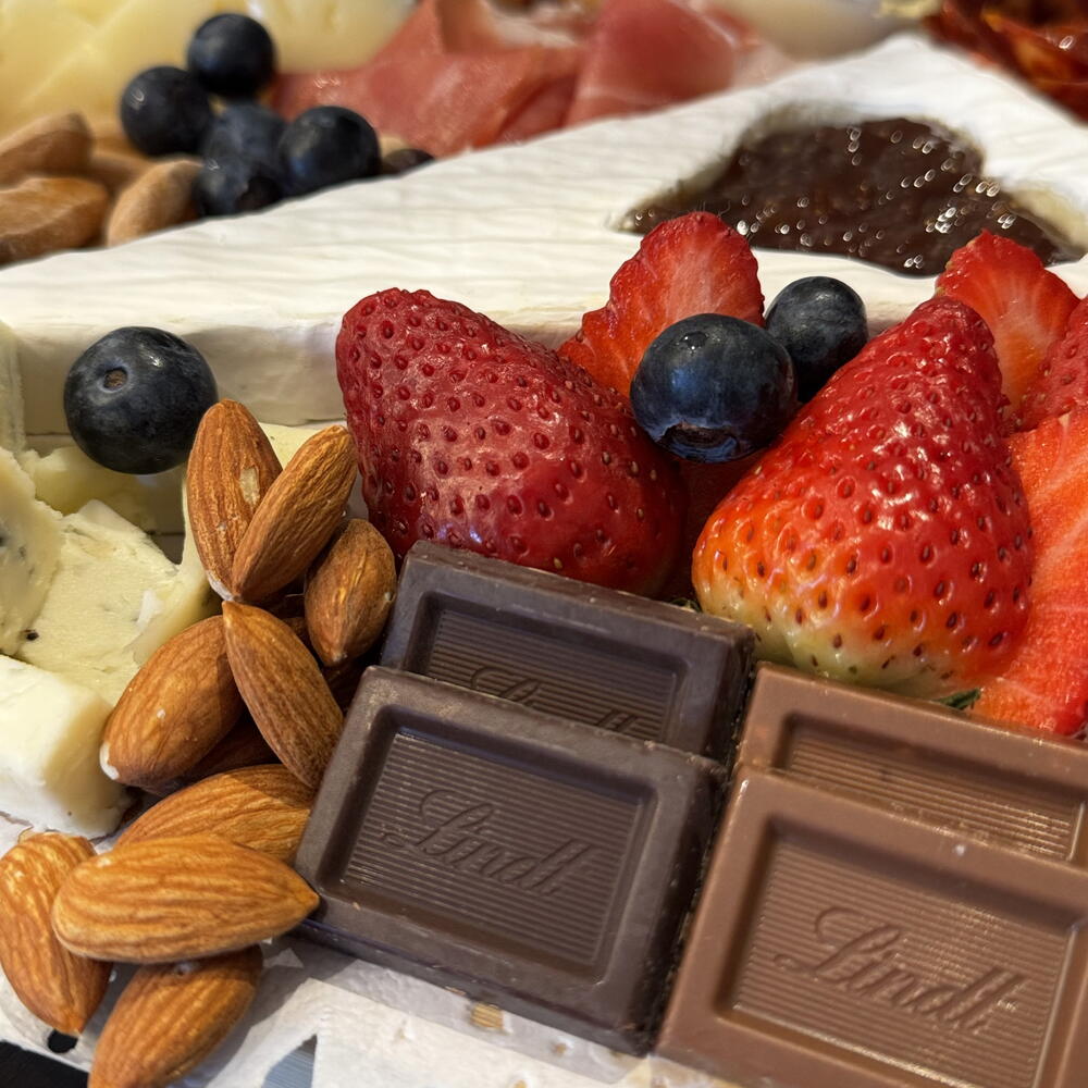 Chocolate - 30 gr fresas - 30 gr salami - 40 gr jamón serrano - 80 gr mermelada - 1 ud. uvas - 100 gr frutos secos - 30 gr queso manchego - 100 gr queso curado - 80 gr queso azul - 80 gr paté - 40 gr queso brie - 100 gr arándanos - 30 gr frutas deshidratadas - 40 gr tostaditas - 6 ud.