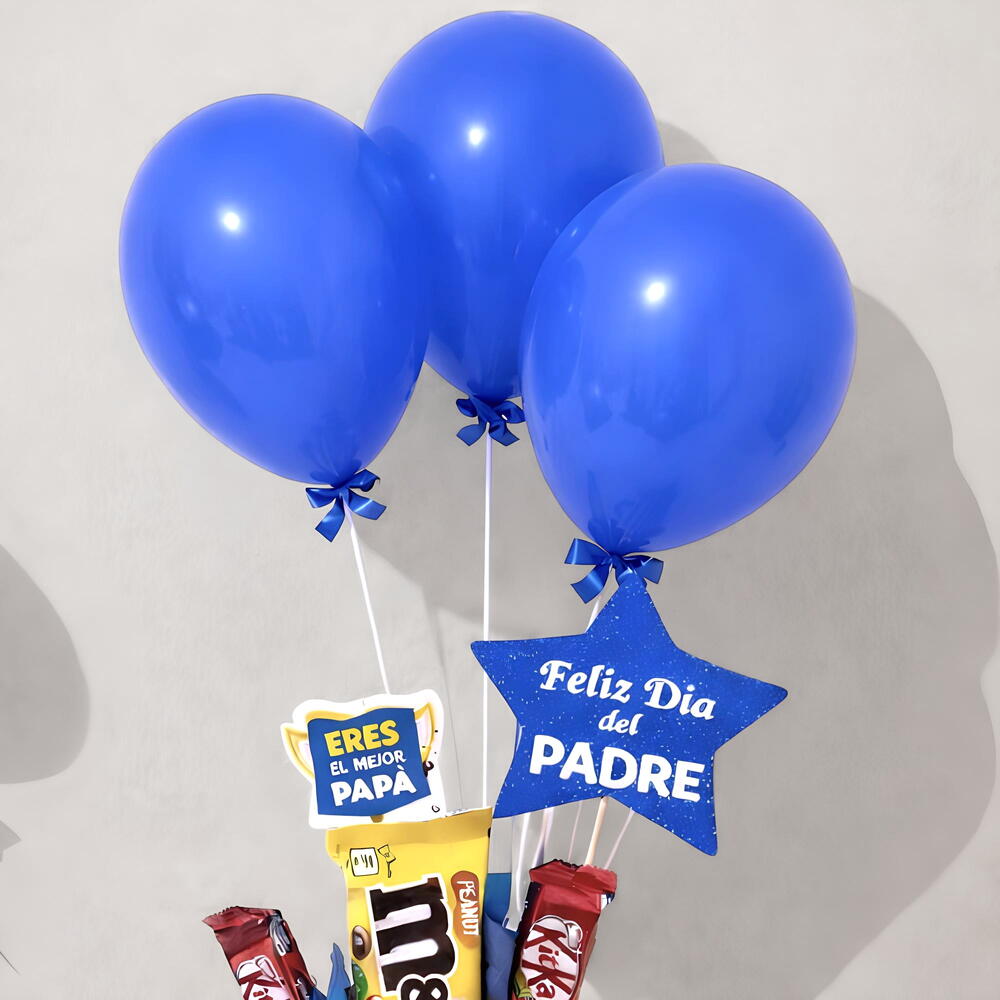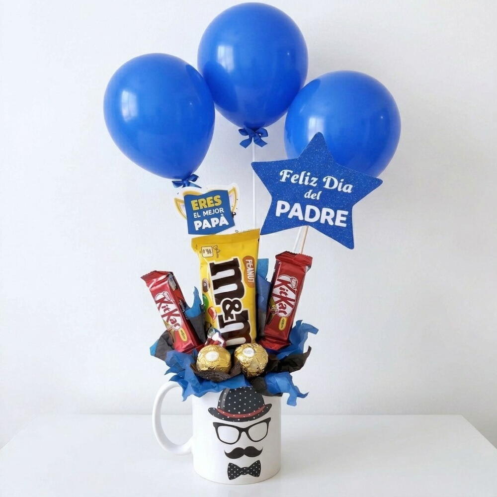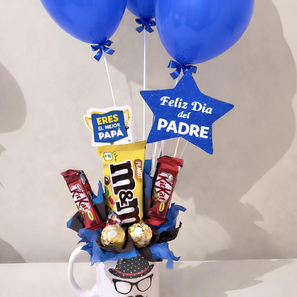 Kitkat - 2 ud. m&m’s - 1 ud. globos - 3 ud. ferrer rocher - 2 ud. taza día del padre - 1 ud. decoración día del padre - 2 ud.