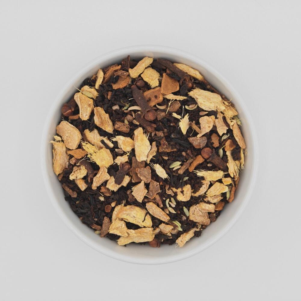 "Chai es una mezcla de té negro y especias que nos llega de la India. Esta aromática y especiada combinación es una bebida popular en todo el mundo y es conocida por su distintivo sabor y beneficios para la salud. Chai combina especias como jengibre, canela, pimienta negra, cardamomo y clavo de olor. Cada una de estas especias tiene su propio sabor y aroma único, creando una mezcla equilibrada e interesante. El té negro sirve como base para la mezcla y también le aporta un sabor rico. Este té se suele tomar caliente. También se puede preparar añadiendo leche y azúcar para suavizar el sabor y hacerlo aún más reconfortante. Ingredientes: té negro Assam, sur de la India, trocitos de jengibre, clavo, canela, cardamomo, hinojo, anís 3 min 100C 2gr/200ml