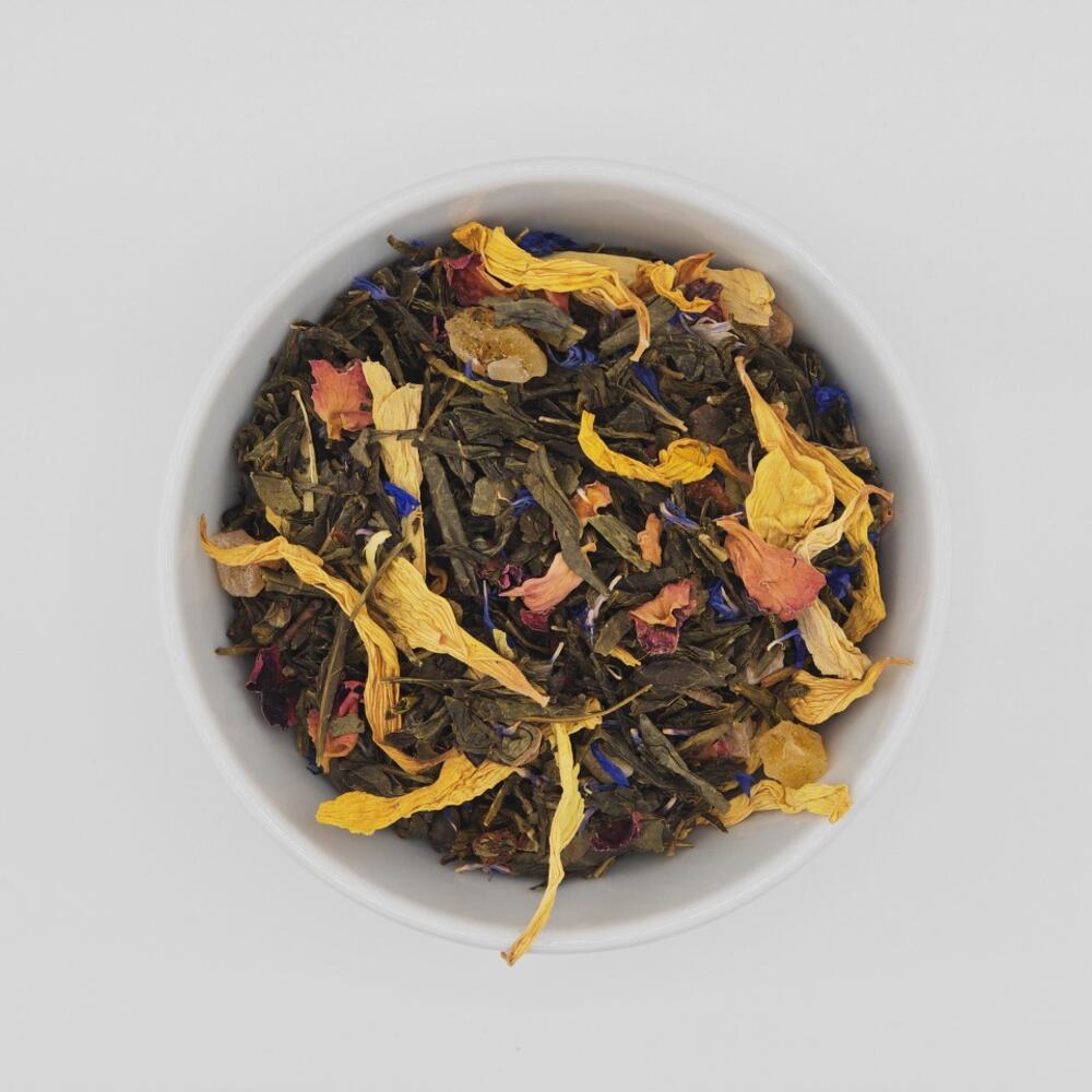 La combinación de sabores y aromas tropicales te transportará a una isla paradisíaca. Los trozos de piña y mango caramelizados aportan dulzura natural que se combina perfectamente con el suave y refrescante sabor del té verde. El aroma natural resalta el bouquet tropical, dándole frescura que se equilibra con la dulzura de las frutas caramelizadas y el delicado sabor de los pétalos de flores. ingredientes: té verde, piña confitada bits (piña, azúcar), mango confitado bits (mango, azúcar)(7%), aroma natural, hojas de flor de rosa, flores de girasol, flores de aciano, trocitos de maracuyá (manzana concentrado de puré, concentrado de maracuyá, antioxidante: ácido ascórbico)(1%) 2 min 90C 2gr/200ml