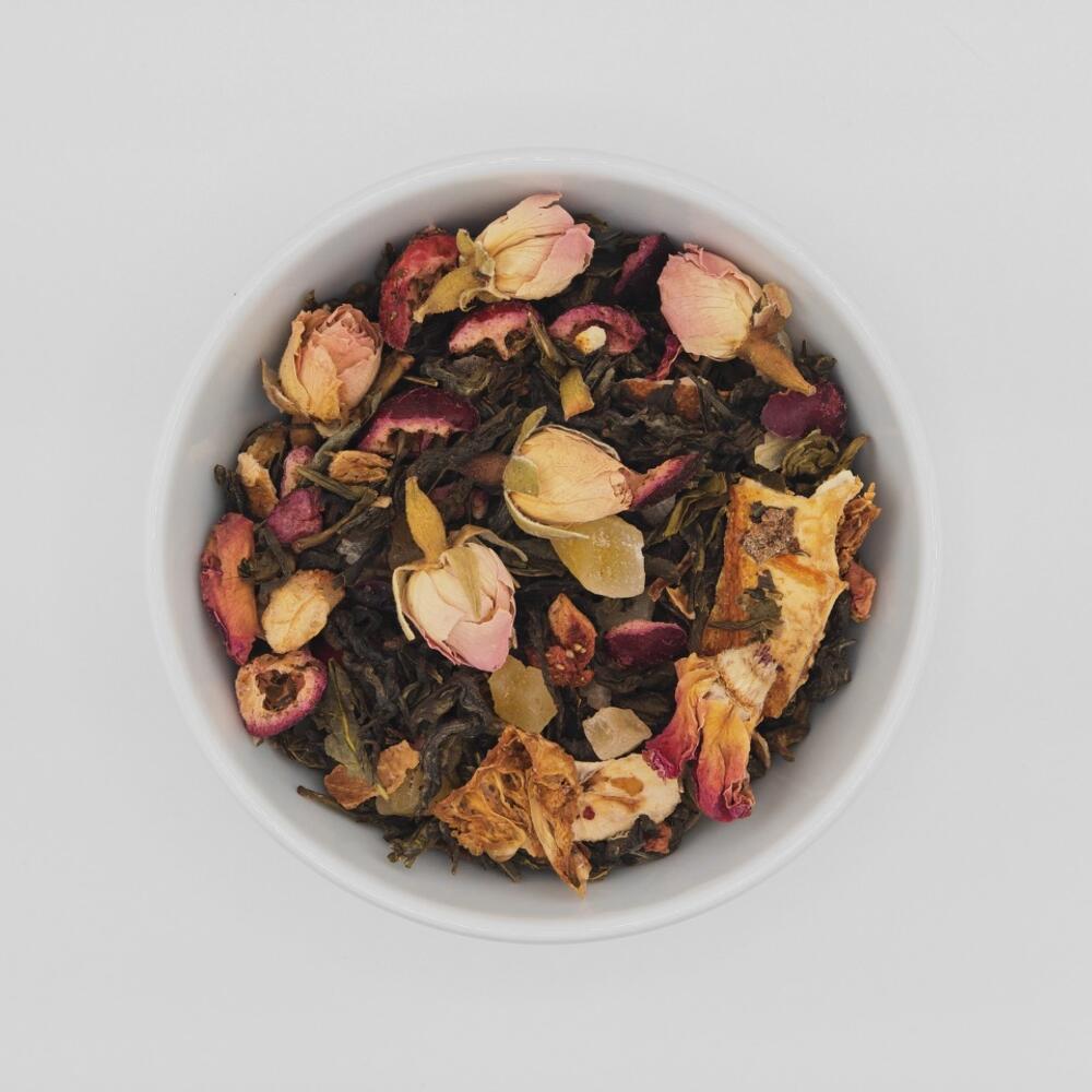 "Este exquisito té combina lo mejor de dos mundos: el delicado sabor del té blanco Mao Feng y la frescura del té verde Sencha, creando una experiencia única de sabor. Los trozos de confitura de piña y mango agregan una nota tropical y dulce, mientras que la cereza aporta jugosidad. Las notas florales juegan un papel importante en esta combinación gracias a los capullos de rosa, que le dan elegancia y refinamiento, creando un equilibrio perfecto entre sabores y aromas que te invitan a disfrutar de una inolvidable mezcla de té. Ingredientes: té blanco China Mao Feng, té verde China Sencha, trocitos de piña confitada (piña, azúcar), trocitos de mango confitado (mango, azúcar), cerezas, aroma, trocitos de naranja (6%), té verde China Gunpowder, cáscaras de limón, pedacitos de arándano, capullos de rosa, pedacitos de fresa (1%) y hojas de flor de rosa 3 min 80C 2gr/200ml
